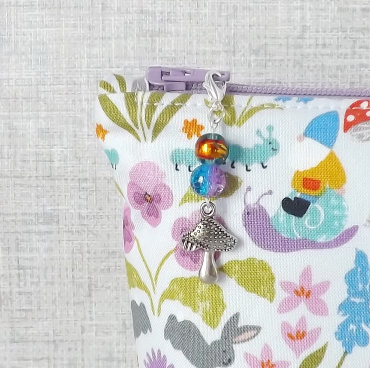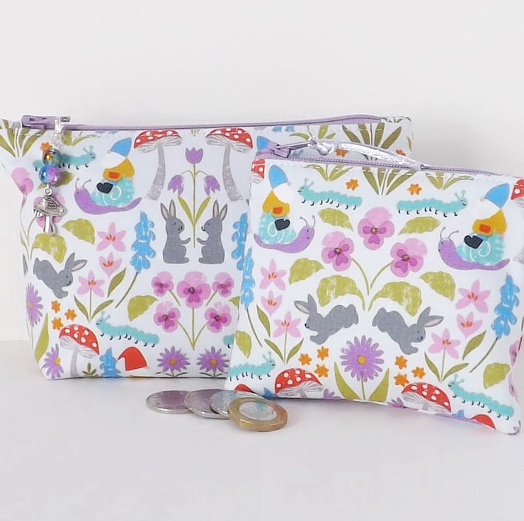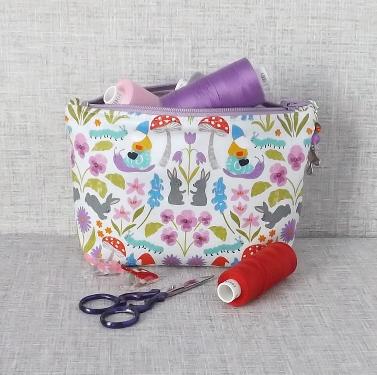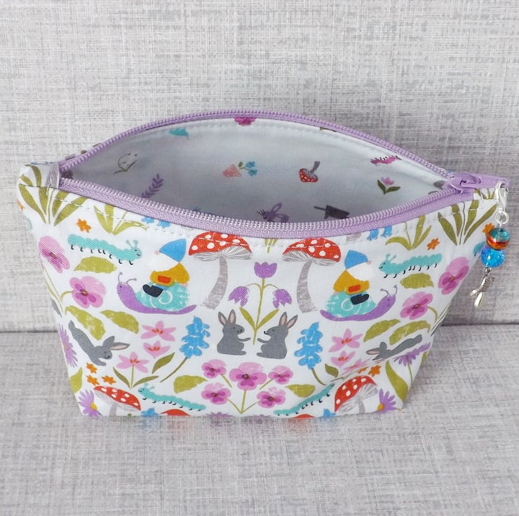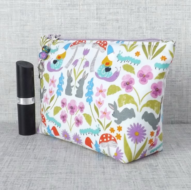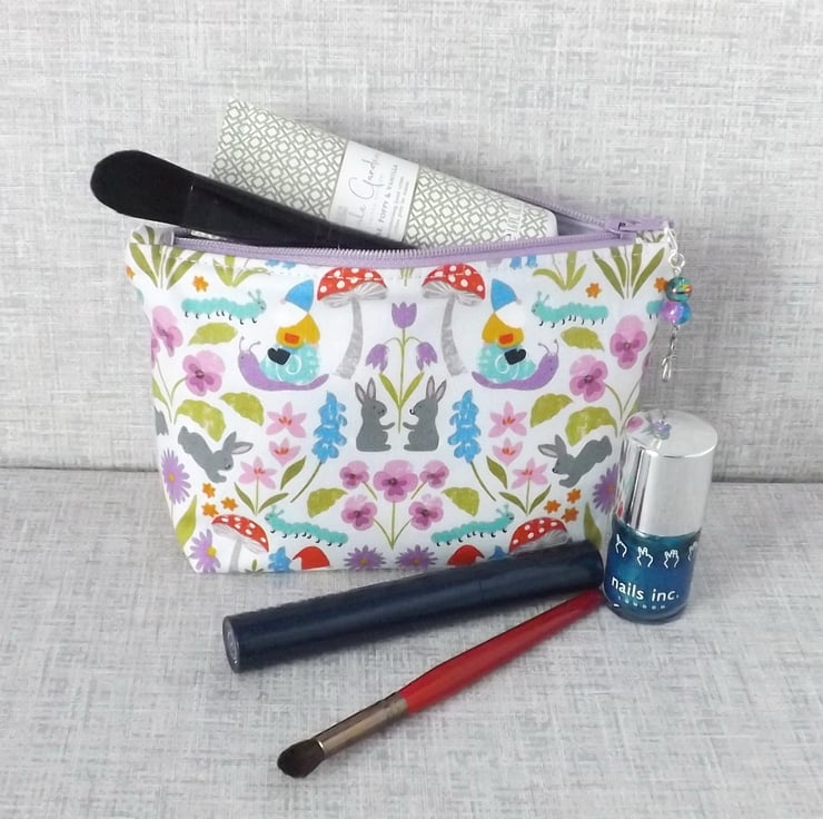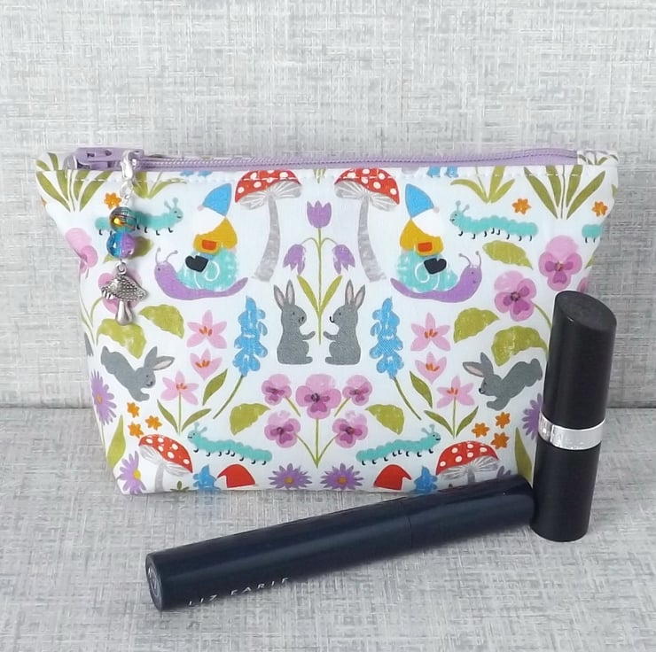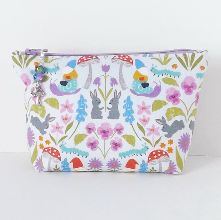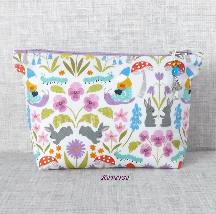 A medium sized make up bag made from a lovely cotton fabric with a charming design of mushrooms, gnomes, bunnies, caterpillars and more, in shades of red, grey, blue, lilac and green on an off white background, The lining is from the same collection with lots of critters, mushrooms & flowers on an off white background.