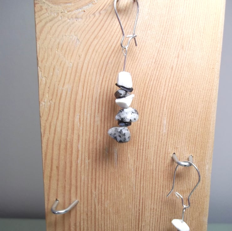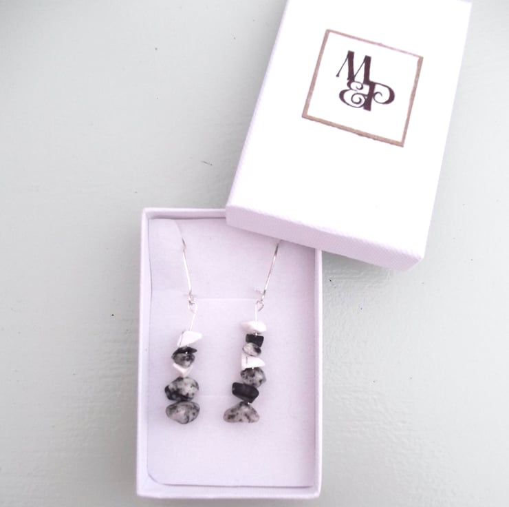 Crystal Stacked Drop Earrings White, Silver, Black and Grey, Diorite, Howlite,