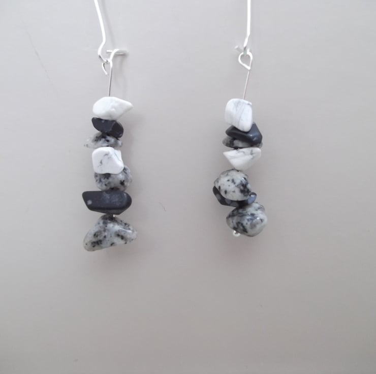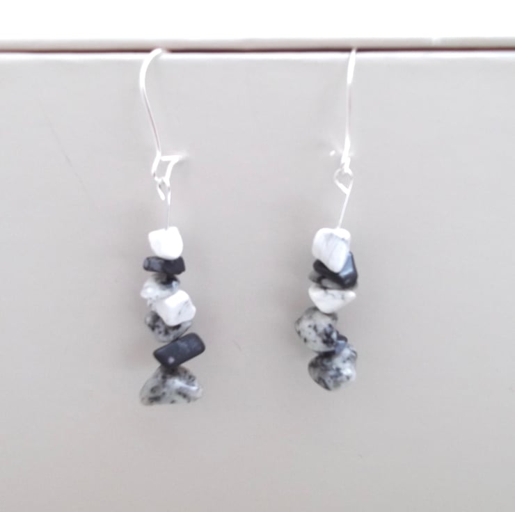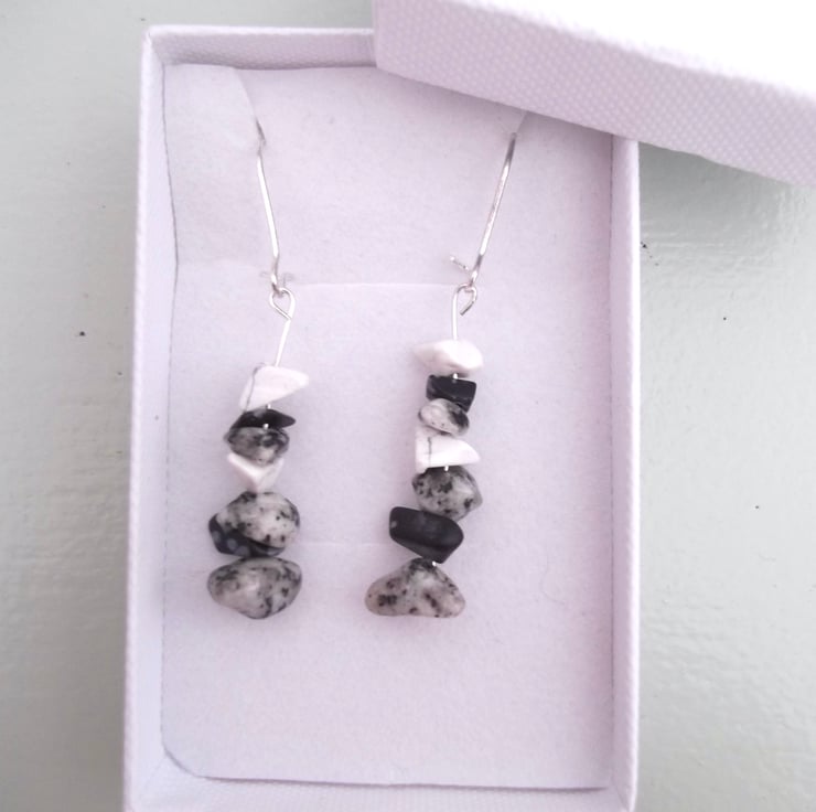 Stacked crystal beads drop earrings. Howlite (white jasper), Snowflake Obsidian and Diorite .