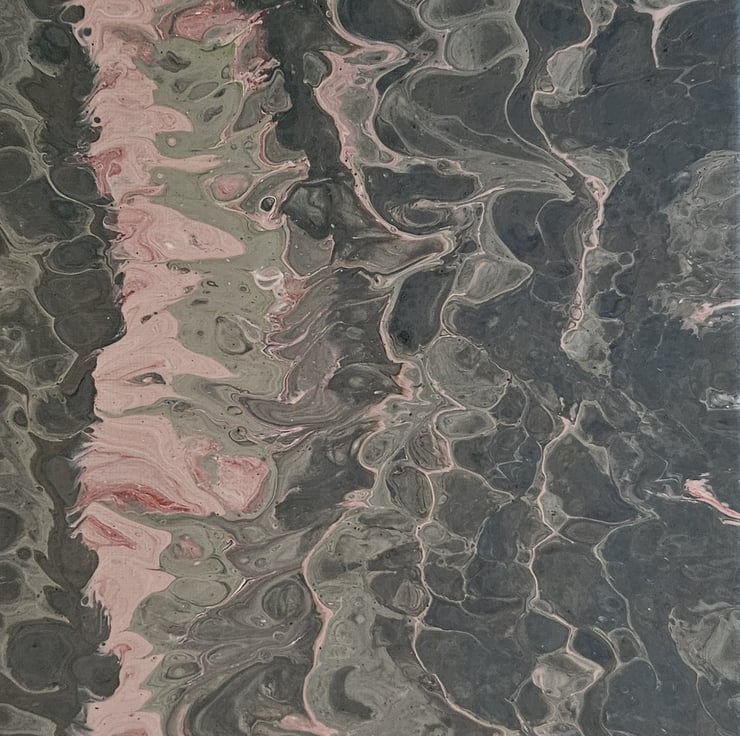 A piece that resulted from scrapping a first pour, mixing the paint again on the canvas and re-spreading it by tilting. The end result was very pleasing!