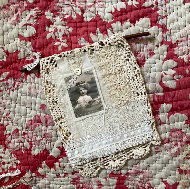 The sepia image has been printed on to calico, and is positioned on top of a piece of scrim and satin ribbon. Trimmed with further antique lace, vintage buttons and silk ribbon bow.