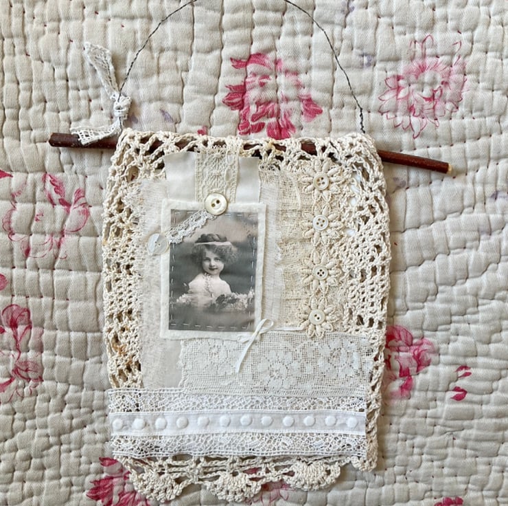The base is a vintage lace doily, over a painted white board, folded in at the sides, and folded at the top to create a casing to hold the twig, from which the collage hangs.