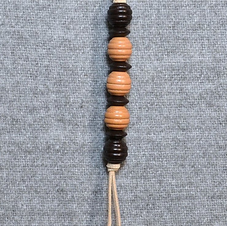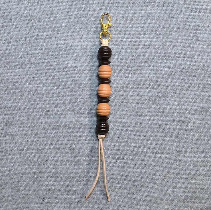 Dark brown and tan beehive beads and dark brown rondelle beads give this bag charm a classic neutrals look. The beads are threads onto beige suede cord and finished with a gold-coloured lobster clasp. The charm measures approximately 19cm, or 7 1/2 inches.