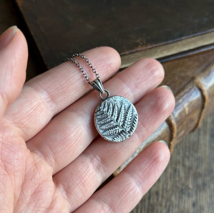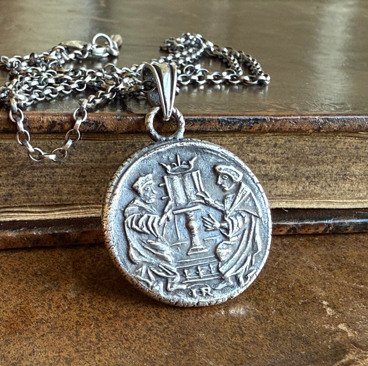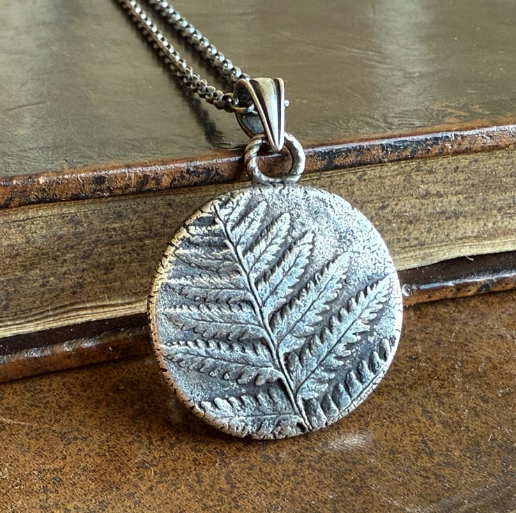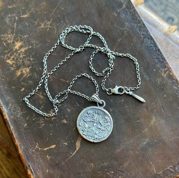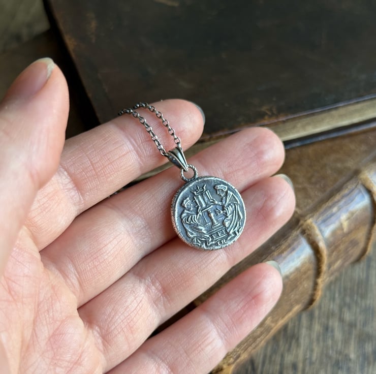 A unique double-sided wax seal necklace. Made with the impressions of an original 17th century document seal featuring two figures and a book and the impression of a Scottish fern leaf on the reverse. Made in recycled sterling silver.