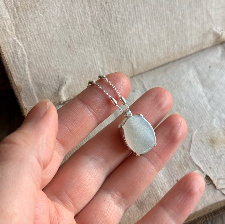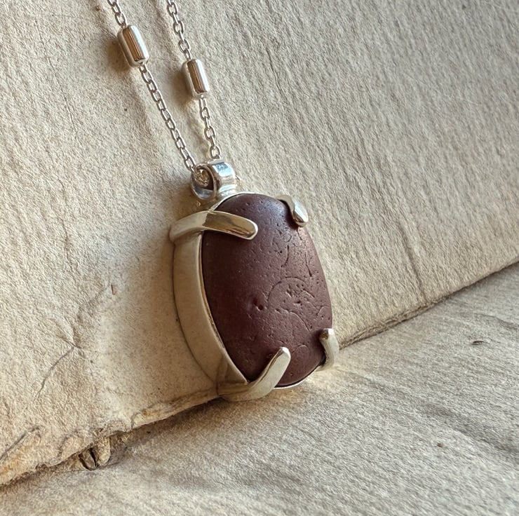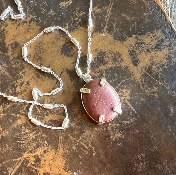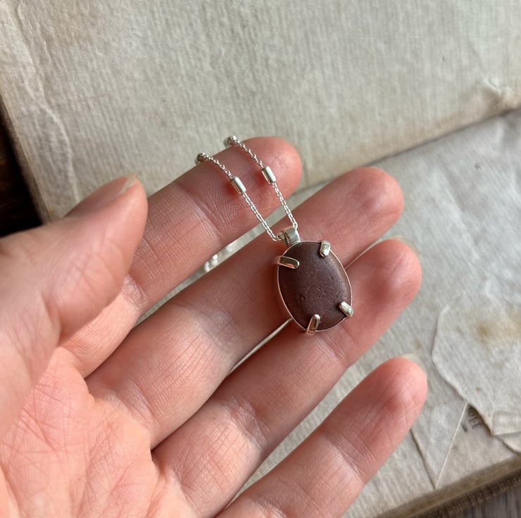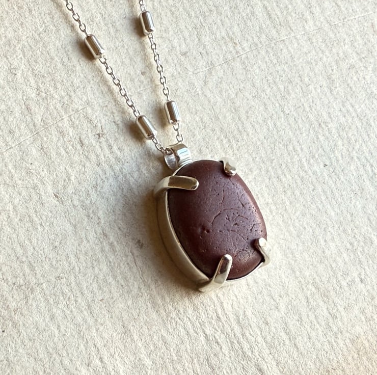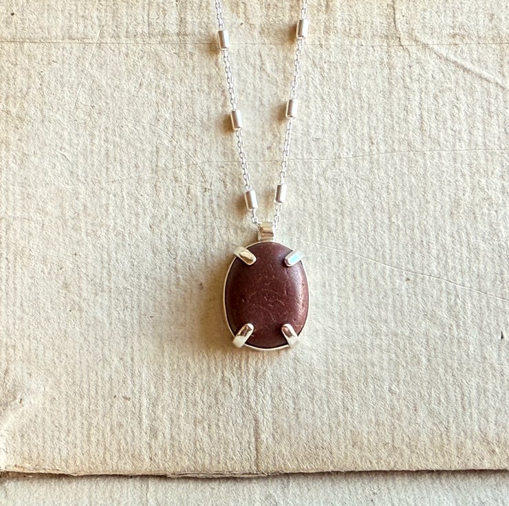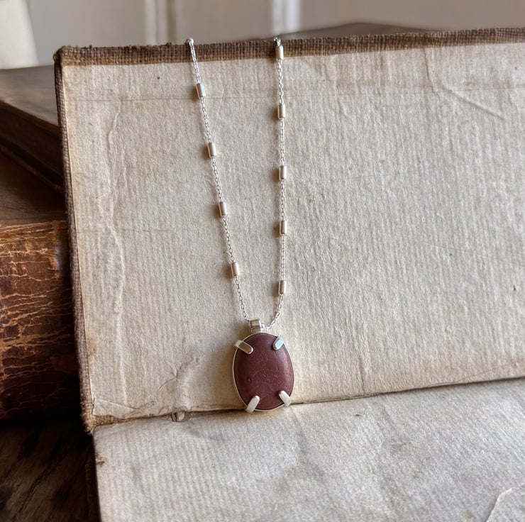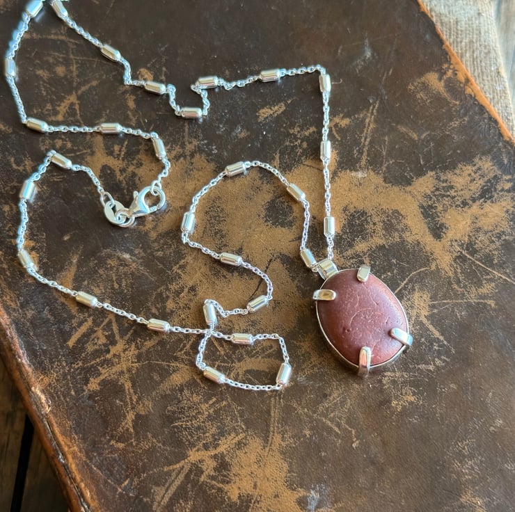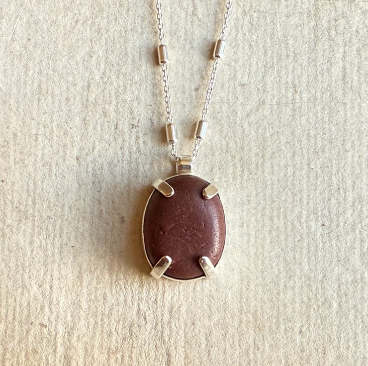 A sweet and simple pebble necklace. Made with a beautiful, perfectly formed red chert pebble we found on the north east coast of England. Set in a silver bezel and hung from a 18' satellite chain.