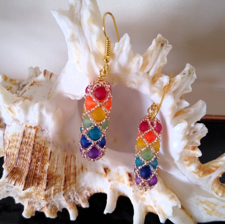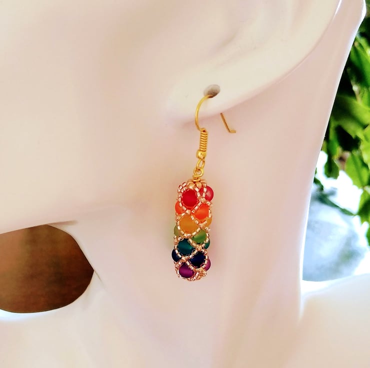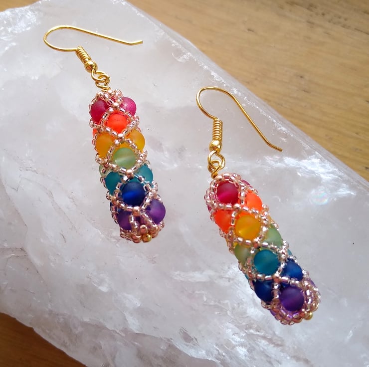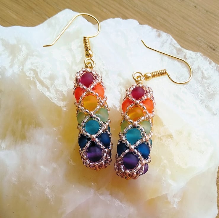 Enjoy an explosion of colour with these boho-chic harlequin rainbow drop earrings. Brightly coloured frosted glass beads, hand stitched together in a diamond netted pattern with tiny golden glass seed beads, to form these stunningly elegant tubular shaped dangle earrings. Each earring will shimmer like stained glass in the sunlight with all the colours of the rainbow.