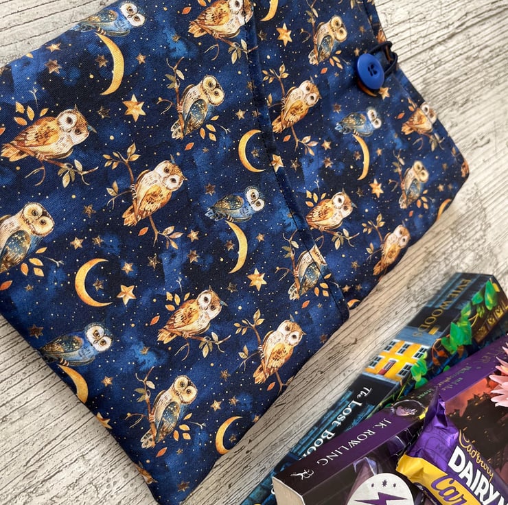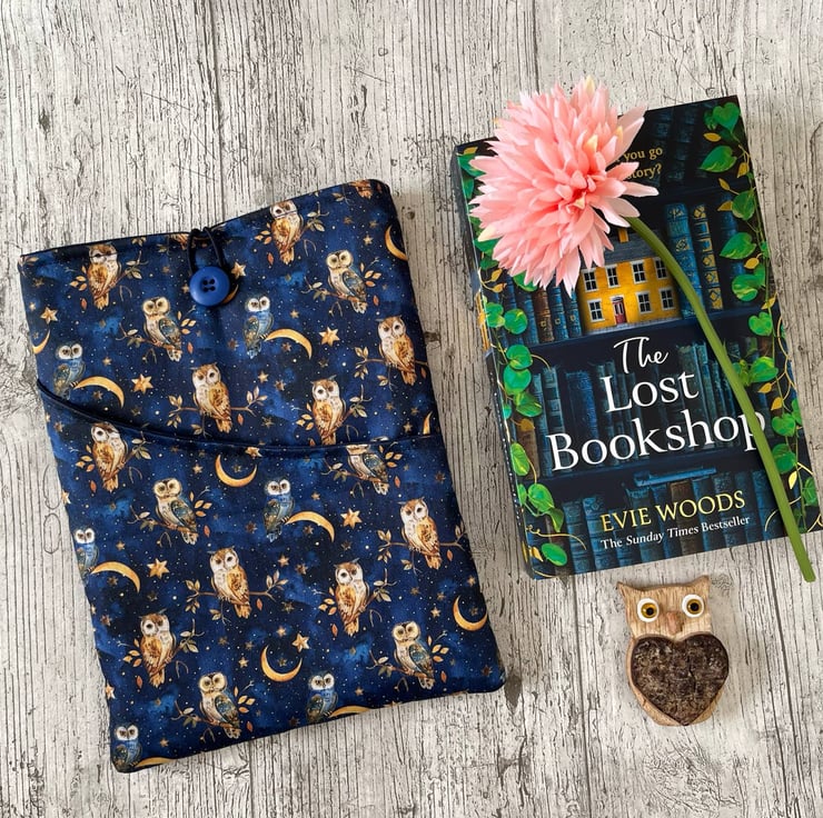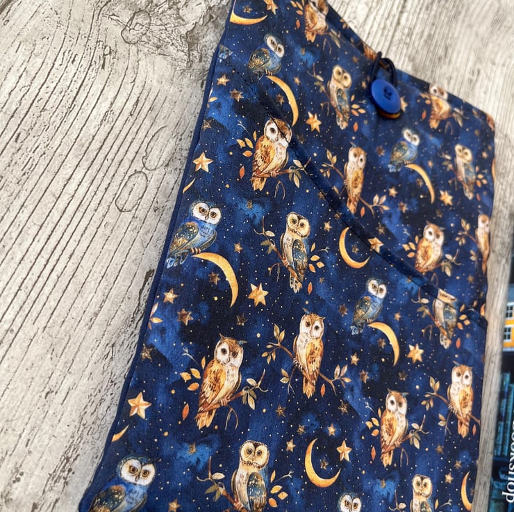 A beautiful, padded book sleeve to hold your favourite paperback book. Perfect to use for travelling, holidays, beach days, relaxing in the garden or inside of the home. The pocket on the front is designed to hold bookmarks, glasses or a treat to enjoy whilst reading. Alternatively, this book sleeve can hold a notebook or diary (a5 or smaller) and pens. This book sleeve is fully lined and padded. The pocket on the front is not padded. The book sleeve has a button and elastic closure.