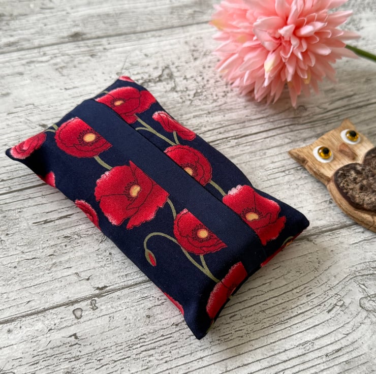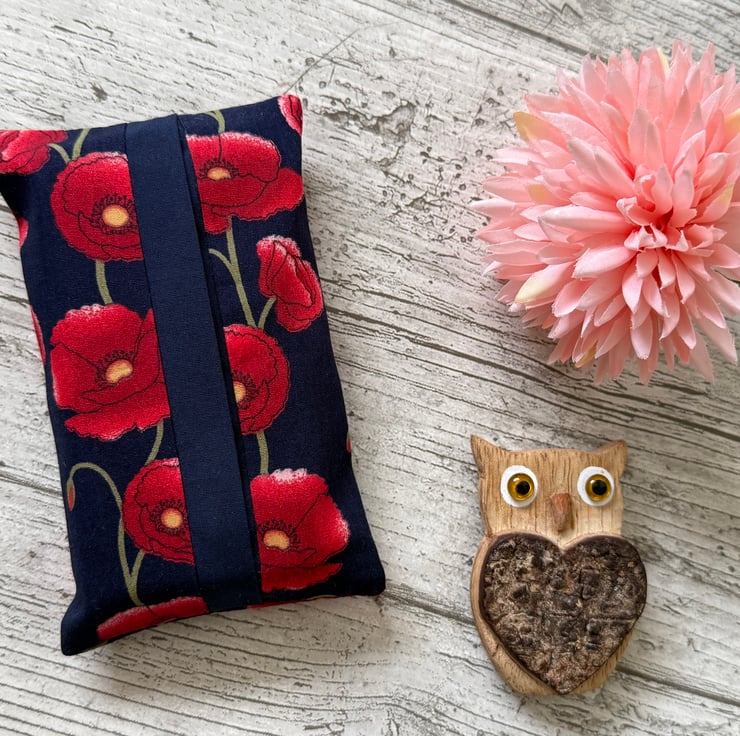 A pretty, reusable holder to carry pocket sized tissues. Navy blue background with a red poppy design.