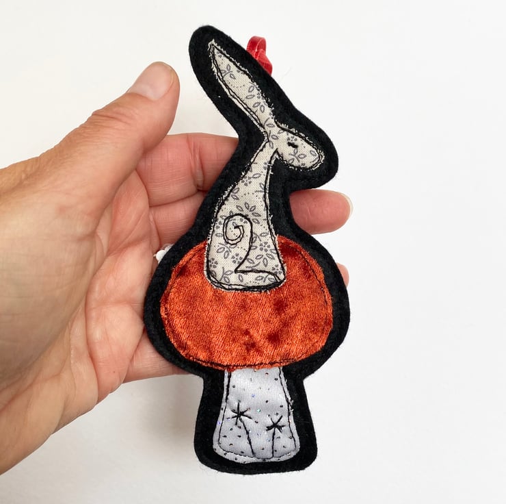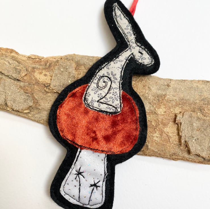 This sweet embroidered hare home decoration shows a hare sat in a bright red mushroom. It has been made from up-cycled fabrics and stitched down with free motion embroidery. It comes felt backed and measure approx 7 x 16cm, with the ribbon the length is 26.5cm.