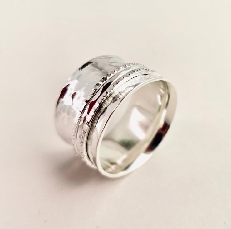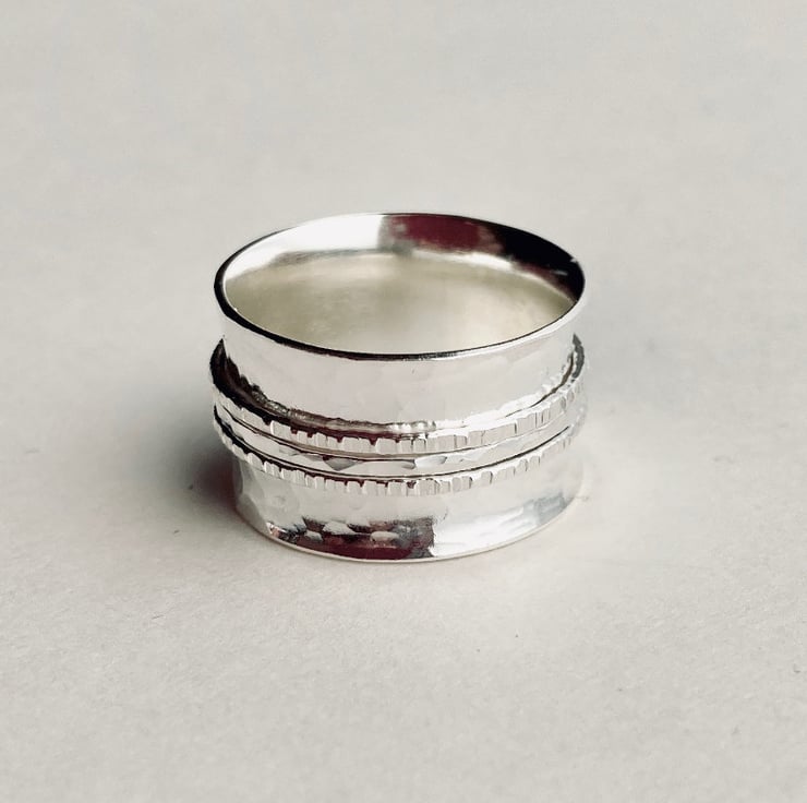 This handmade sterling silver spinner ring features a beautifully hammered main band and three individual spinning bands, with contrasting textures to stand out. It’s a lovely piece to fidget with or simply enjoy for its tactile charm and eye-catching design. The main band is approximately 12mm wide, with each spinner band around 1mm.