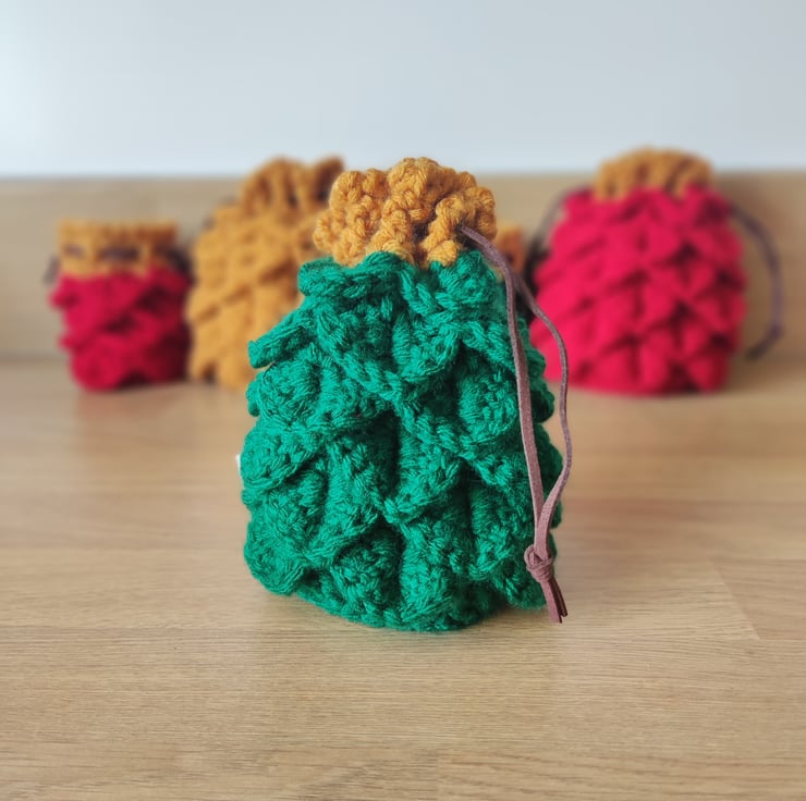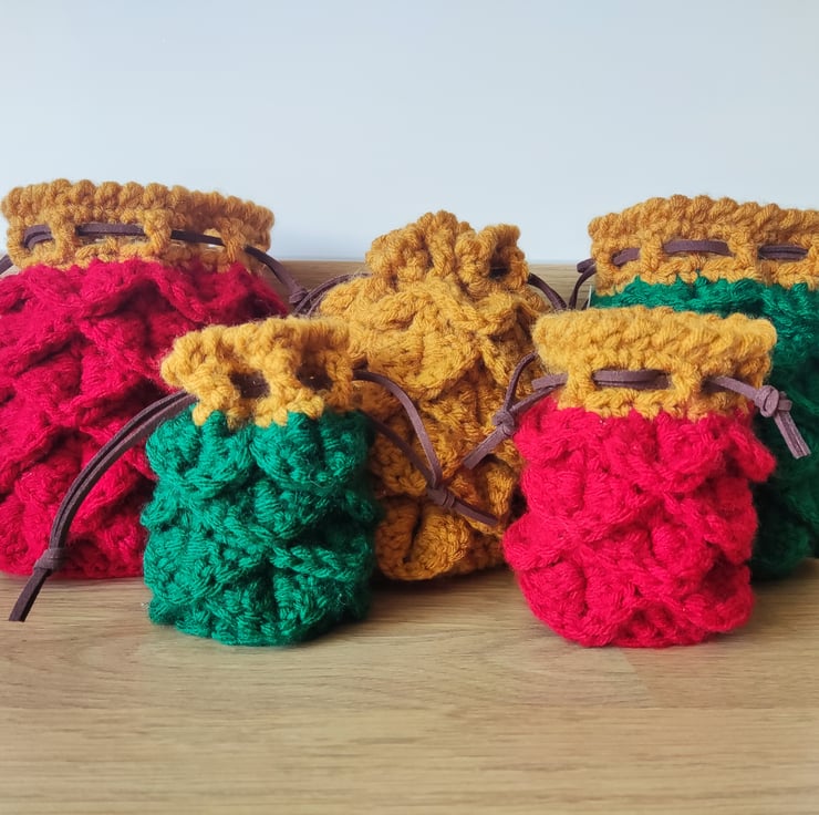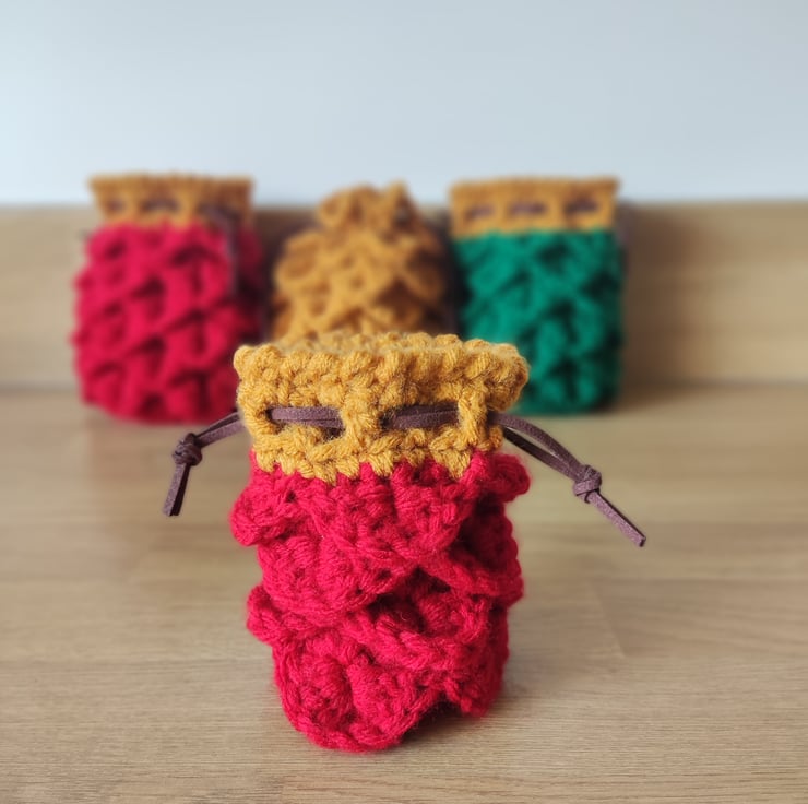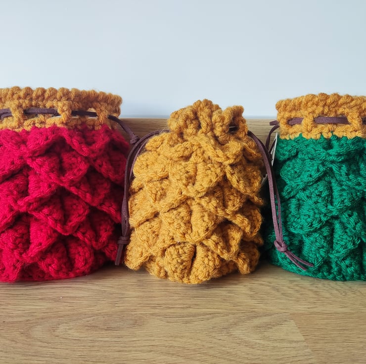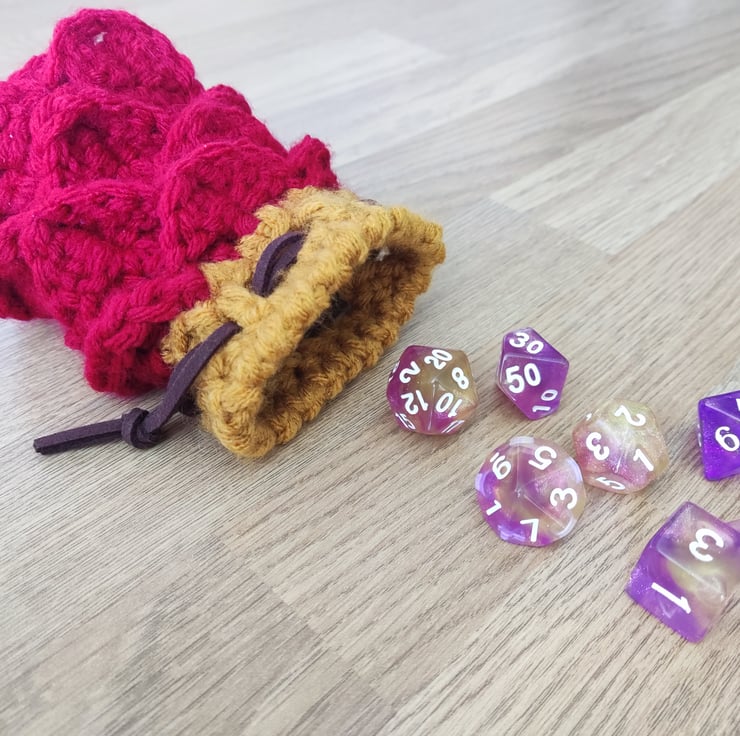 Hand crocheted dragon scale dice bags in two different sizes, a brilliant gift for lovers of table top games who are looking for a stylish bag for keeping their dice safe. The small dice bag is perfect for players, fitting 1-2 dice sets. The large dice bag, capable of fitting up to 12 dice sets, is the ideal bag for Game Masters. With a flat base, this dice bag stands proud allowing for easy access and space saving during play.