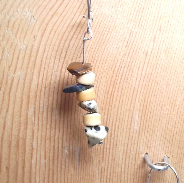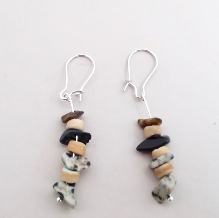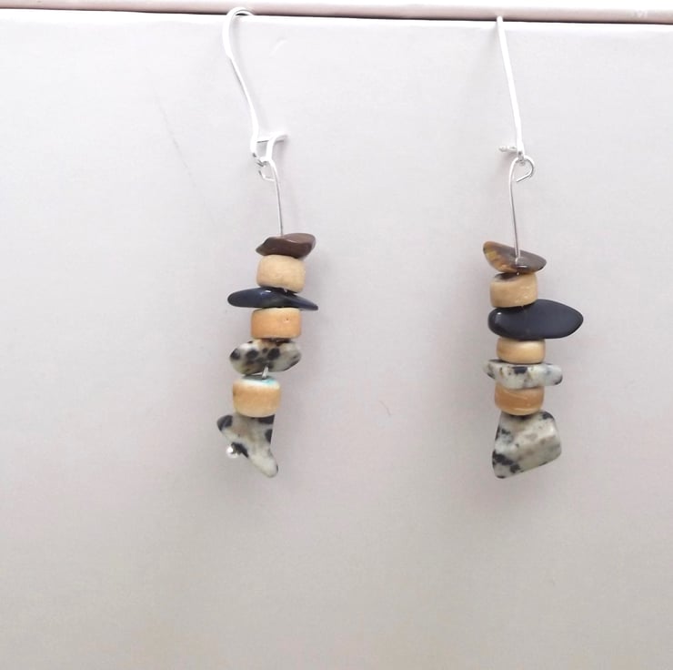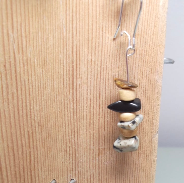 Tigers eye, vintage wood bead, black obsidian and Dalmatian jasper dangle drop earrings with stacked crystal gems.