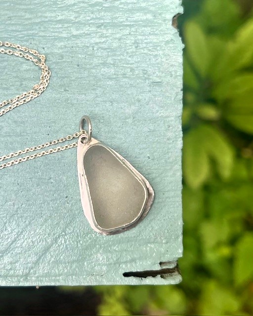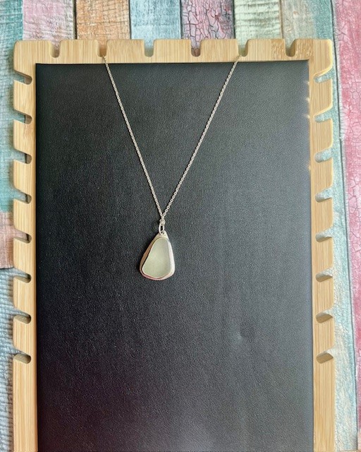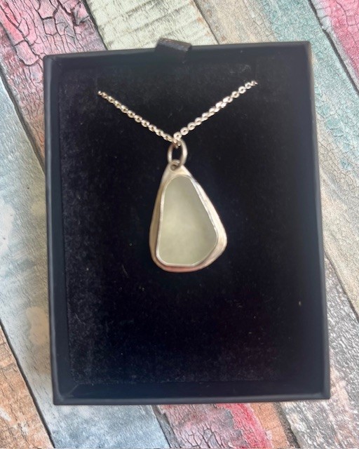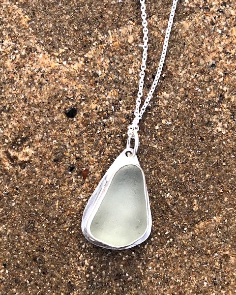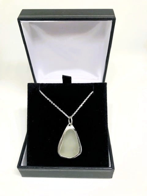A beautiful handmade pendant necklace, made with a pale translucent piece of sea glass which is bezel-set in solid 925 recycled sterling silver. The pendant features a piece of sea glass I found on a beach on Gower peninsula, which has been tumbled & shaped by the sea. As no two pieces of sea glass are ever the same, this necklace is one of a kind. I have carefully hand-set the sea glass in recycled sterling silver & it hangs on a 925 sterling silver 16” curb chain.