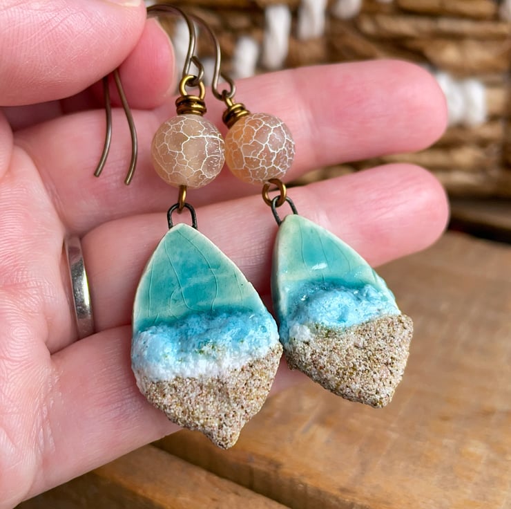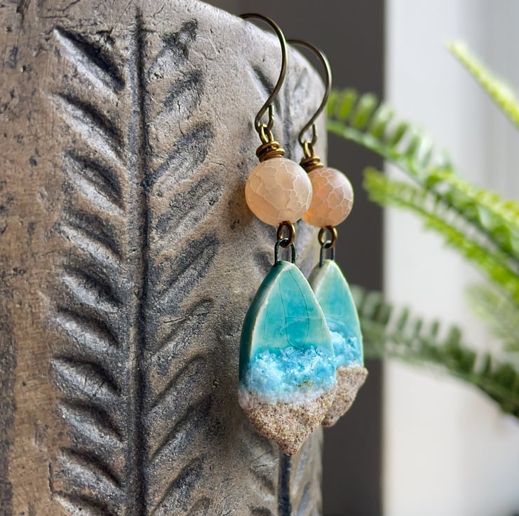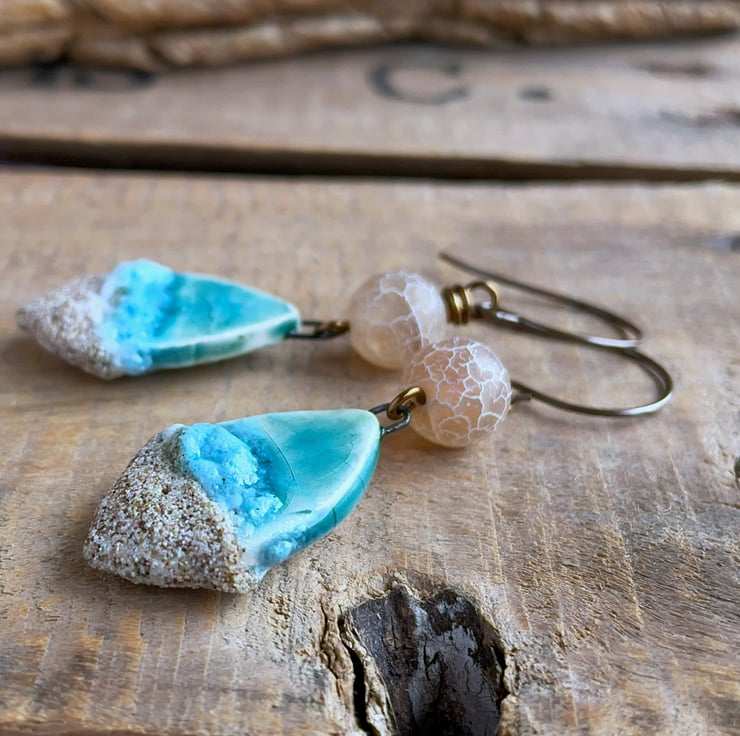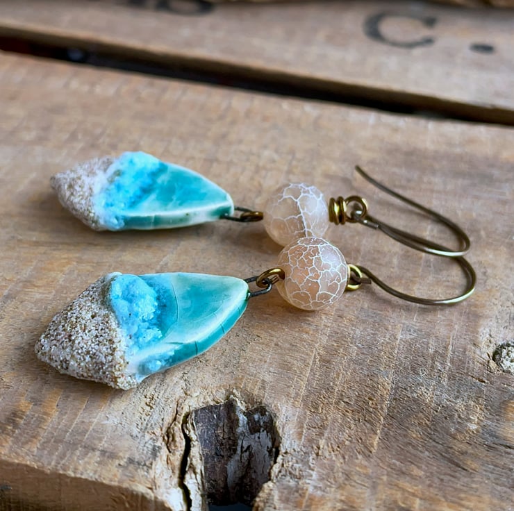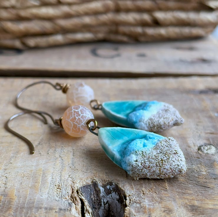 These handmade earrings feature soft brown dyed crackled agate beads paired with stunning ceramic drops by UK bead artist Petra Carpreau. The colourful ceramic charms are textured with fine sand from Woolacombe beach in North Devon, giving them a truly coastal feel.