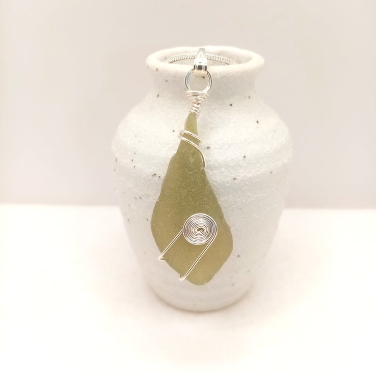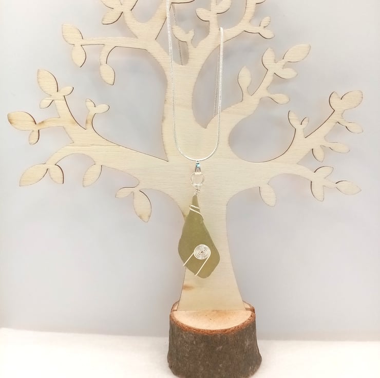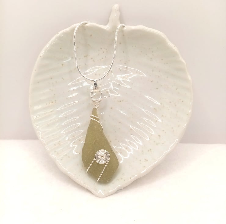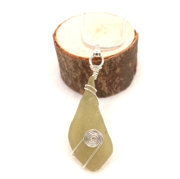 Wire wrapped sea glass pendant in olive green with silver plated snake chain.