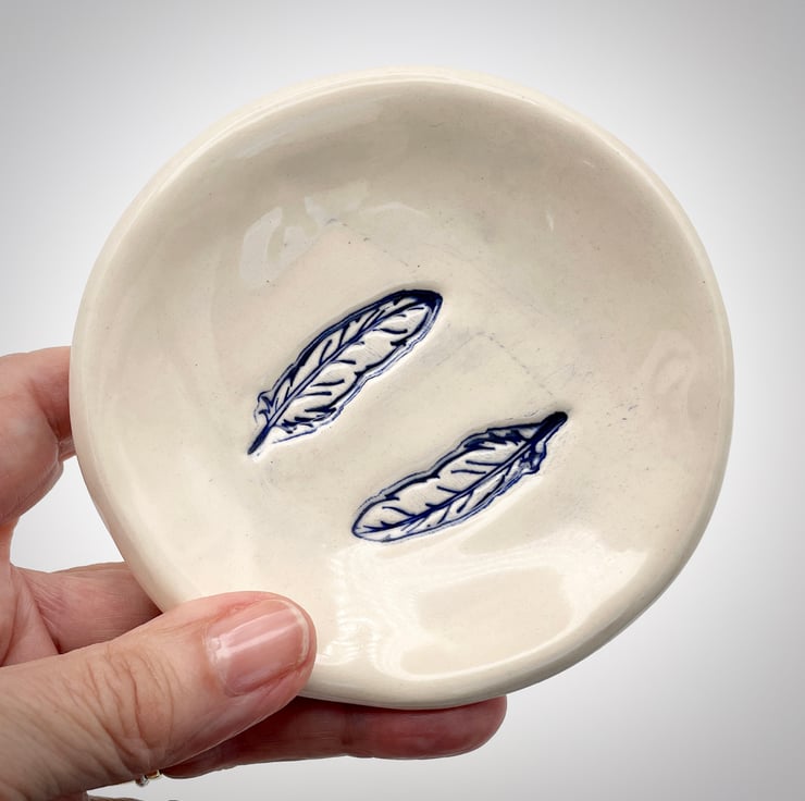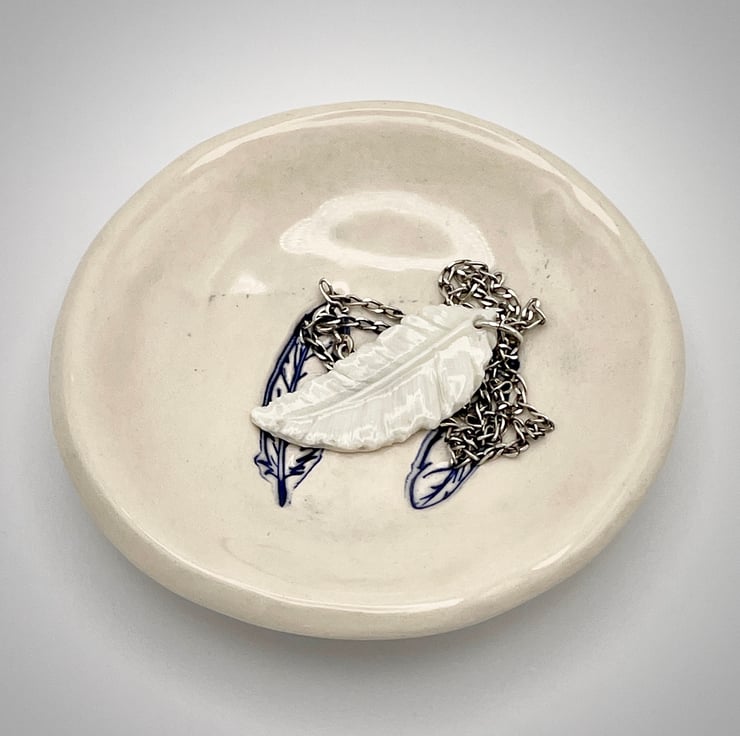 This is my white and blue ceramic trinket dish embossed with a pair of twin feathers - perfect for rings, jewellery, trinkets and little treasures.