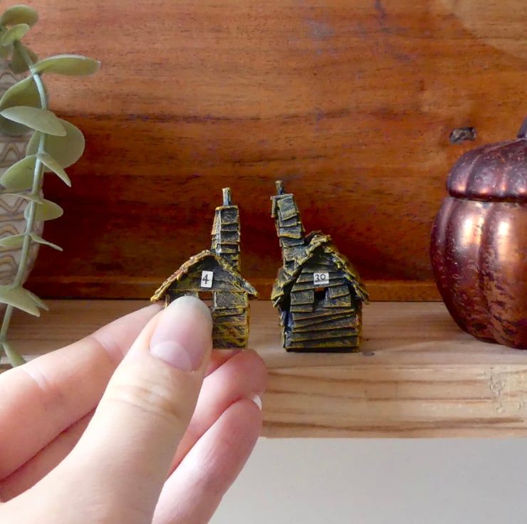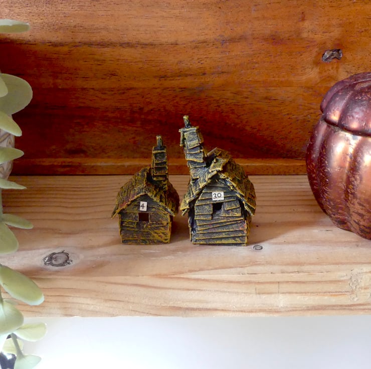 I paint each house carefully by hand and add the tiny numbers cut from vintage book pages to correspond with the dates in October