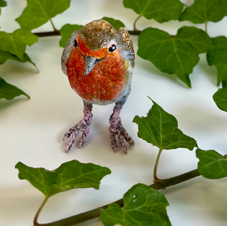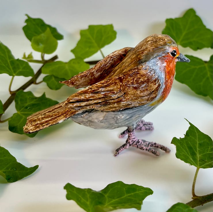 Painted in naturalistic colours with Windsor and Newton acrylic paints, the robin has also been given a couple of coats of acrylic varnish. He has aluminium wire legs and feet.