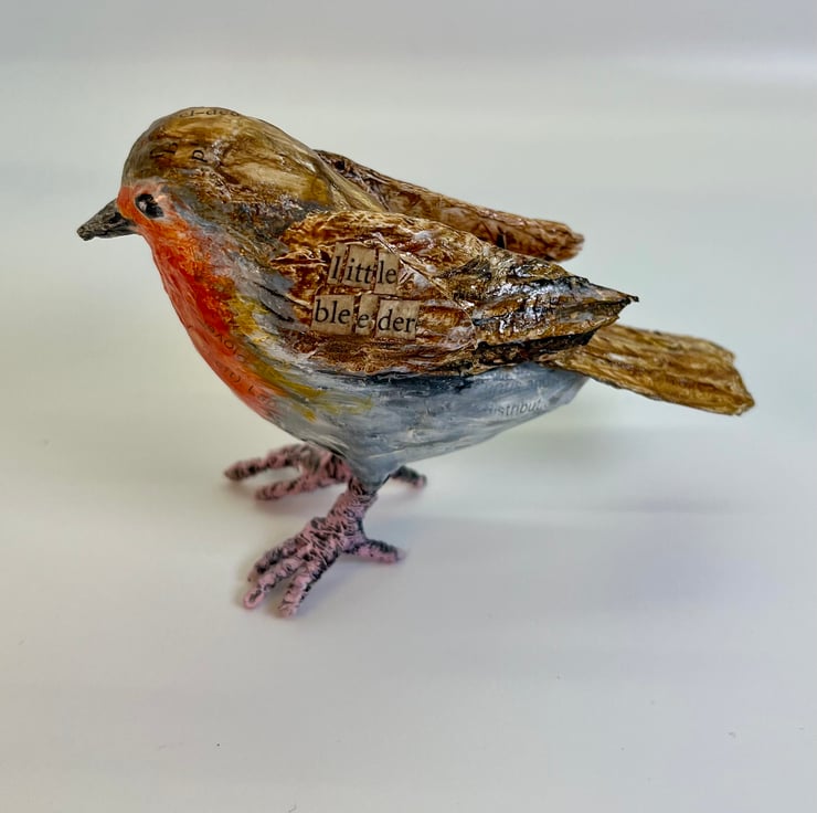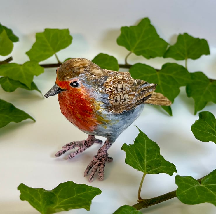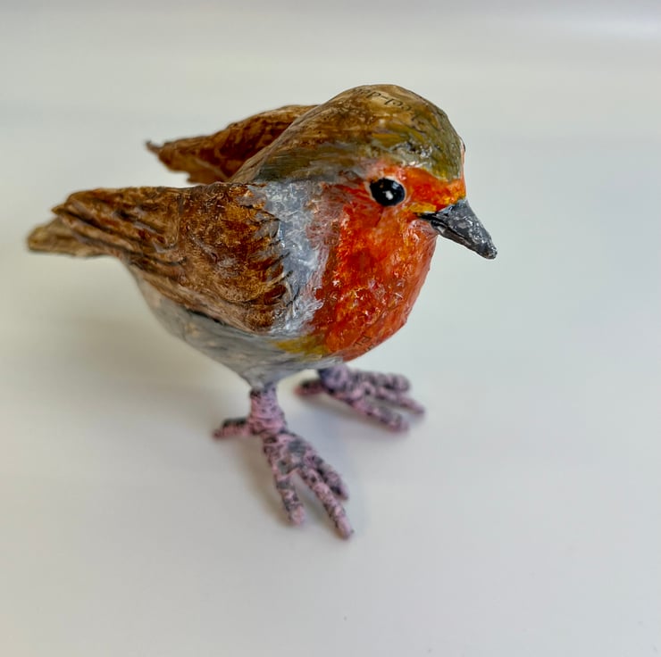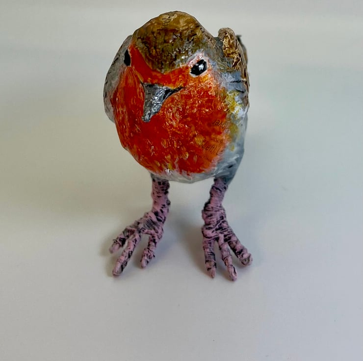 A feisty Robin sculpture made from recycled magazines, card and aluminium wire.