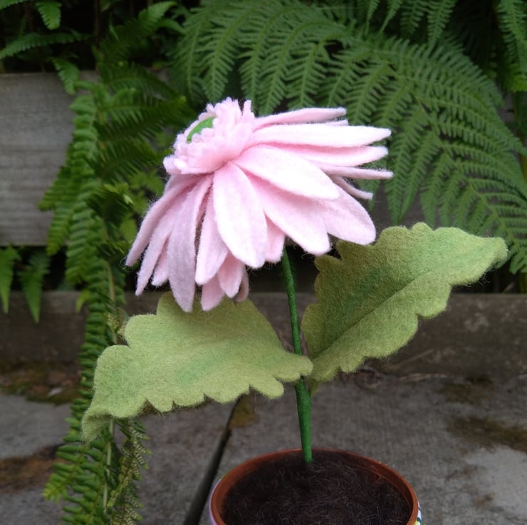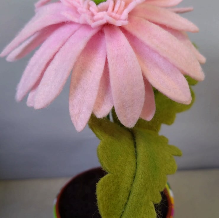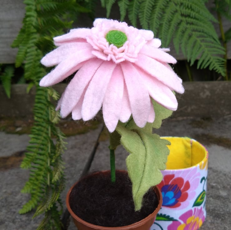 Handmade pink gerbera flower made from wool blend felt. Every petal and leaf is hand cut and shaped Flower is in a plastic flowerpot with a handmade fabric pot cover, which is made from patterned cotton. The fabric cover can be removed if you want to put the flower into your own ceramic pot. The flower is approximately 22cm high and the flower is approximately 10cm in diameter. Plant and leaves can be bent as they are on wires. Comes with free UK postage.