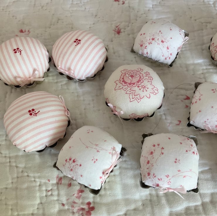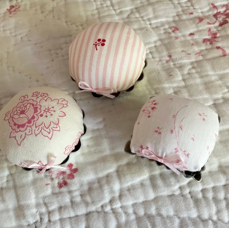 Each pin cushion is made from a gorgeous piece of Moda fabric. Trimmed a silk ribbon bow.