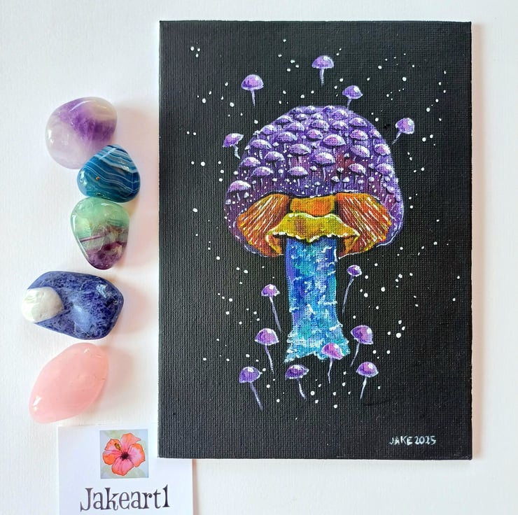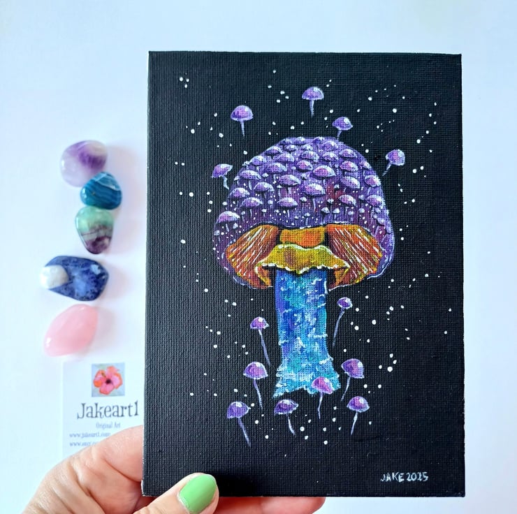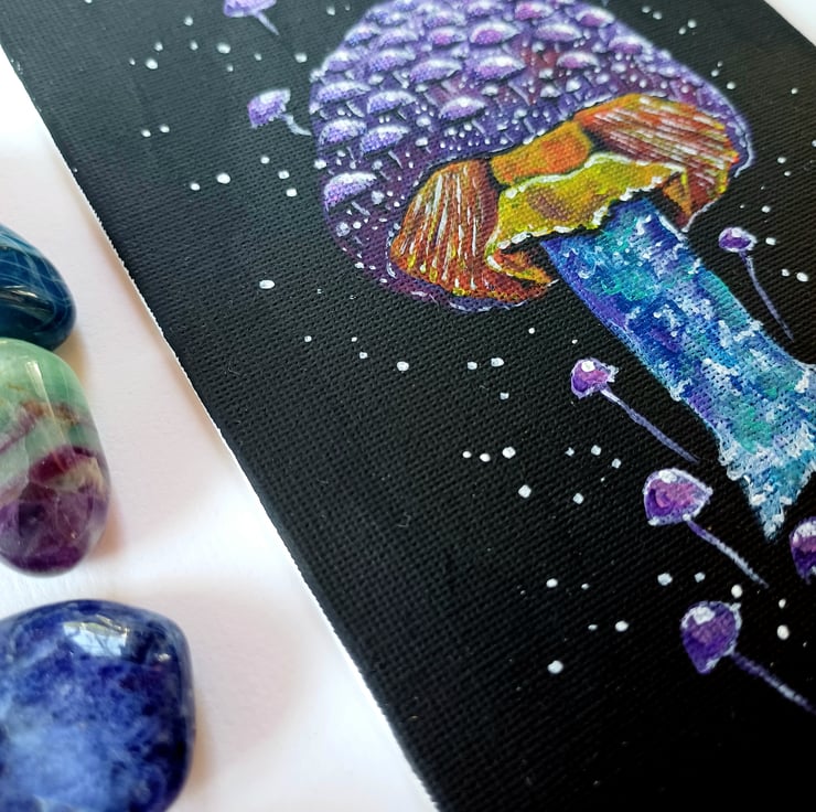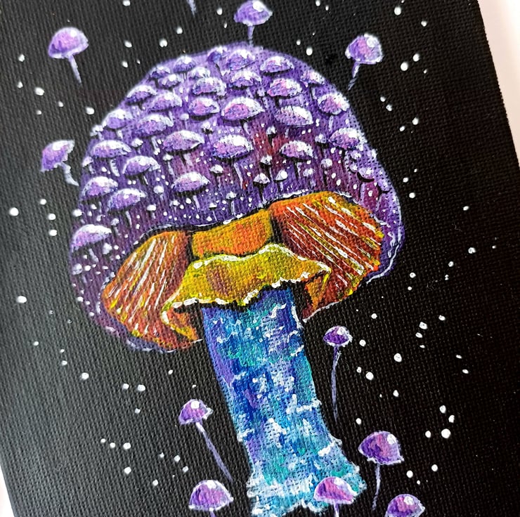 A fantastical magical mushroom original painting. This was hand painted by me in acrylics on a flat canvas panel measuring 18x13cm. The black background shows off the vibrant colours and shimmery paint. It's signed by me and will be carefully wrapped in tissue paper and posted in a sturdy postal box. One only available.