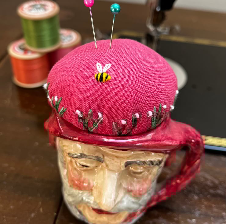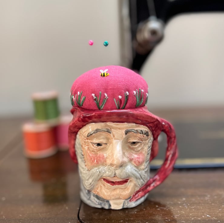 Pincushion in a vintage Toby jug - hand painted ‘Peter Davey’ design by Artone. The reclaimed pink linen cushion has been embroidered with tiny flowers and a bee.