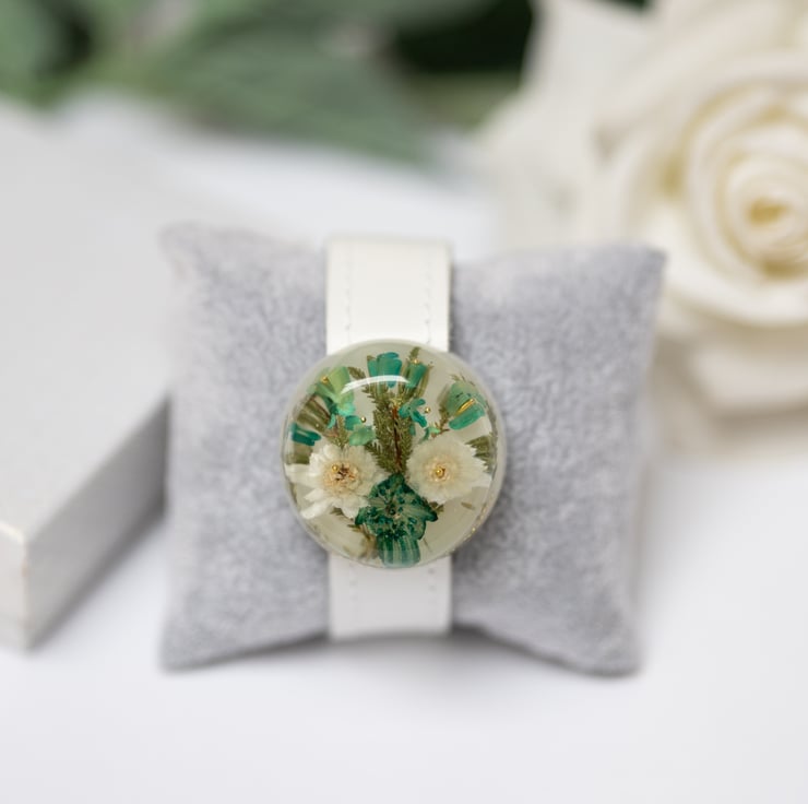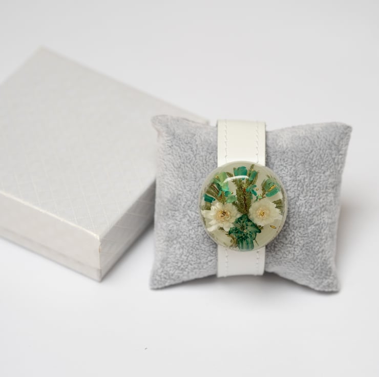 White wide leather bracelet with pressed flowers in resin Women wrist band watch