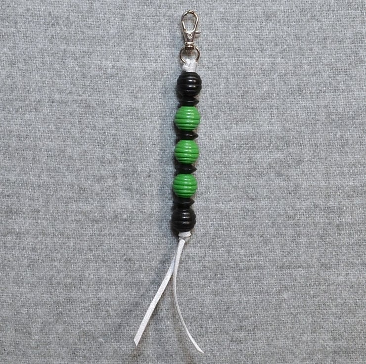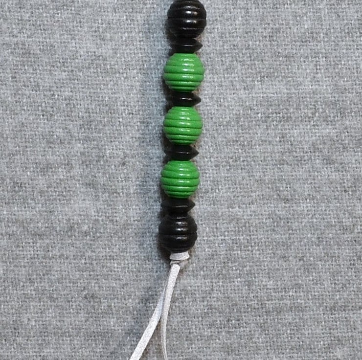 Bag Charm – Black and Green Wood Beads on Grey Suede Cord