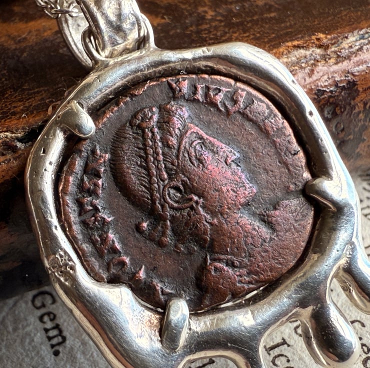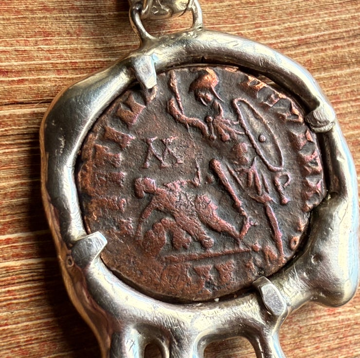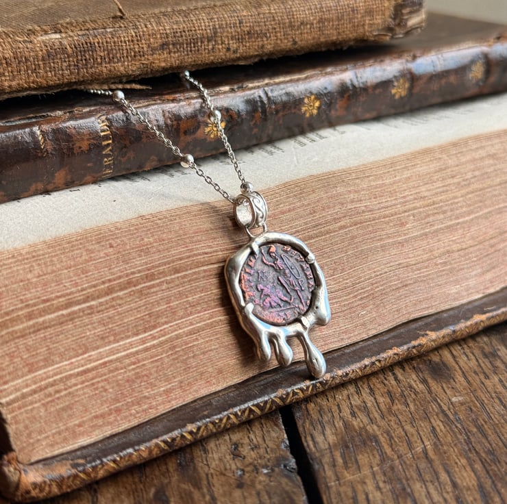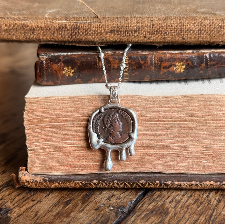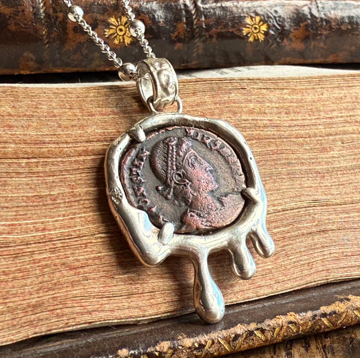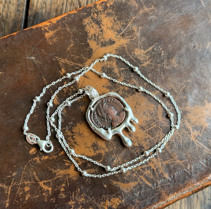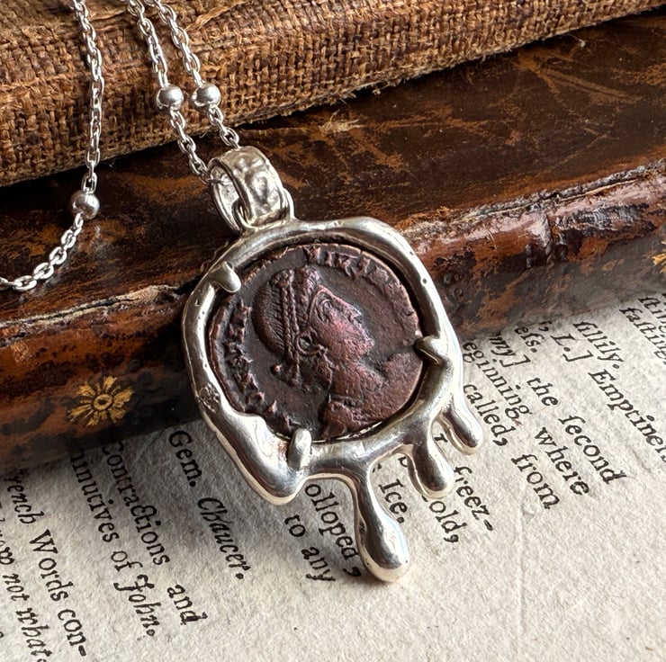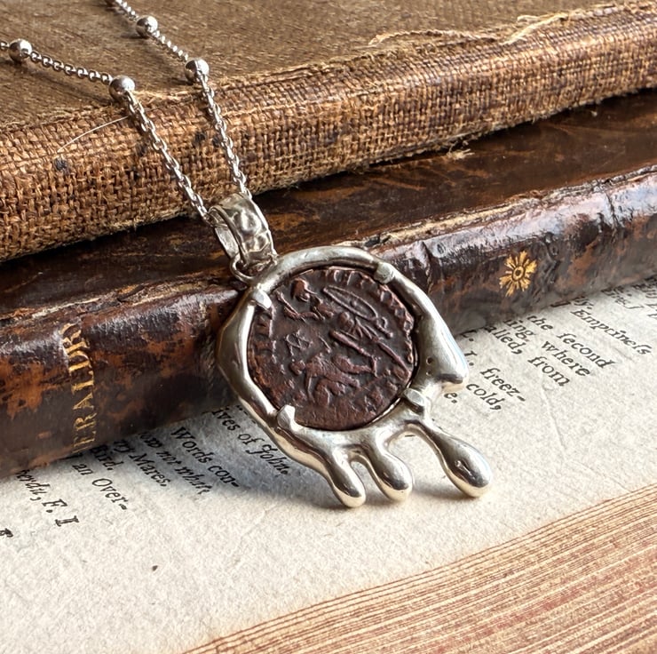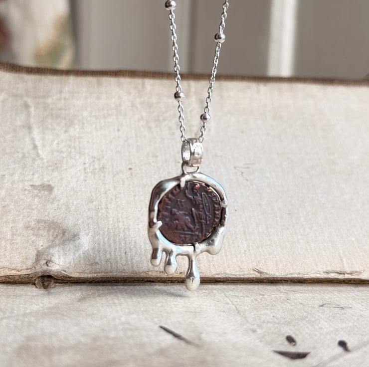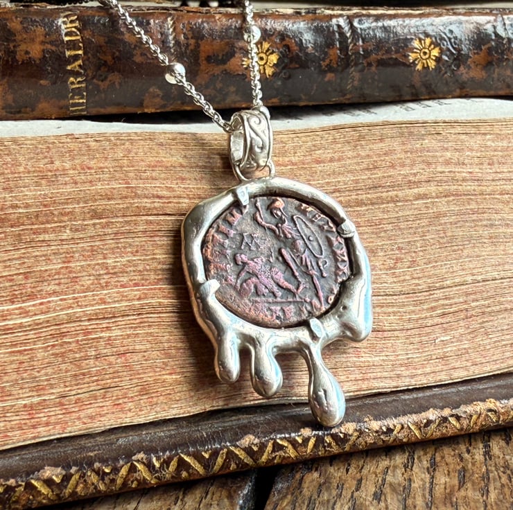 A one of a kind authentic roman coin 'drip' necklace, The roman drip necklace is inspired by my silver casting process. The coin was found in the UK (thought not by us.)