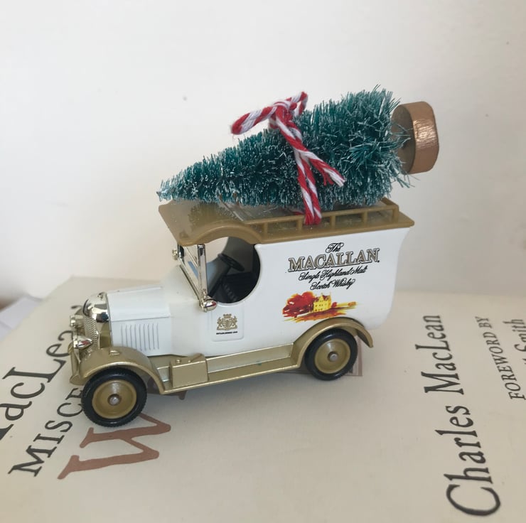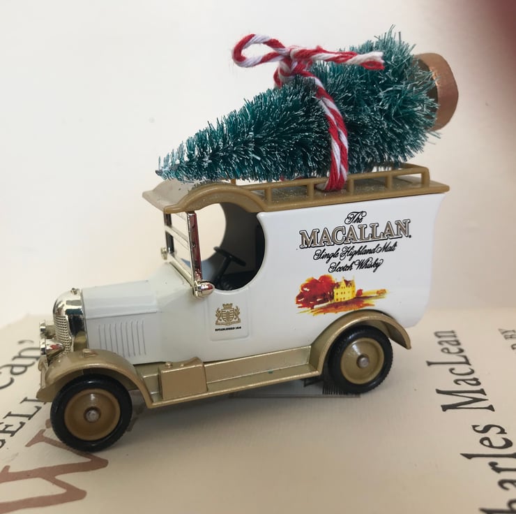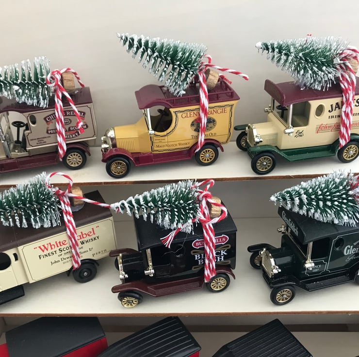 Carefully collected die cast vehicles and re purposed into CHRISTMAS decorations. Perfect for WHISKY collectors. Shelf decor and unique gift topper. 3”