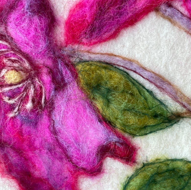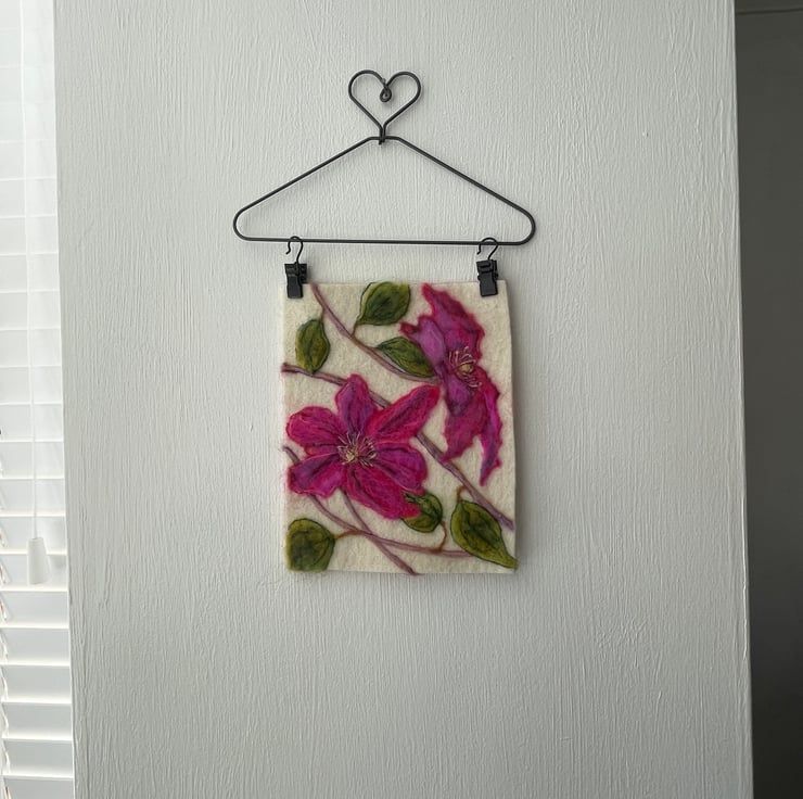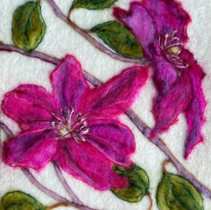 A hand-felted Clematis artwork crafted from merino fleece.