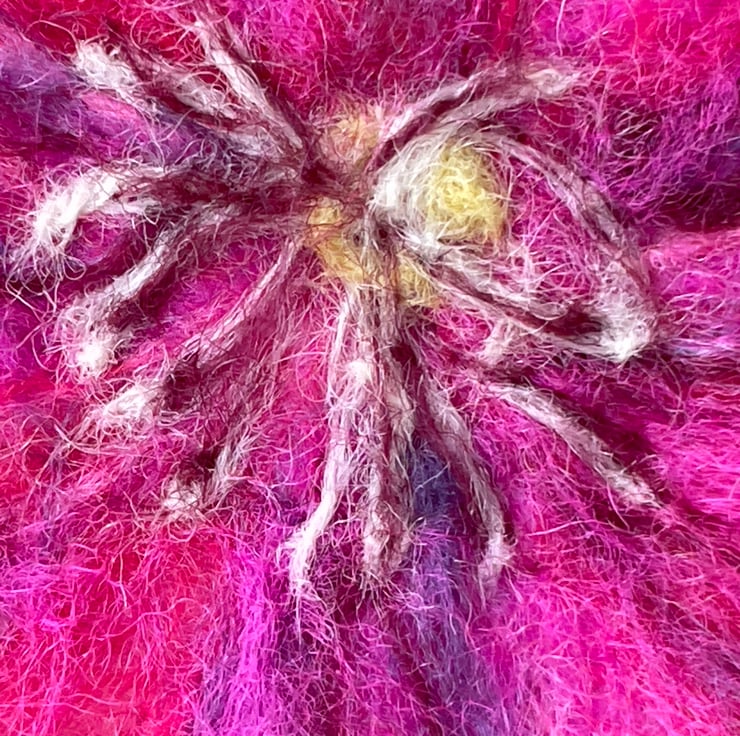 This clematis felted art work has been inspired by the wildlife, landscape and domestic gardens around the UK. This clematis piece celebrates the colours of mid summer flowers with its bold shades of pink.
