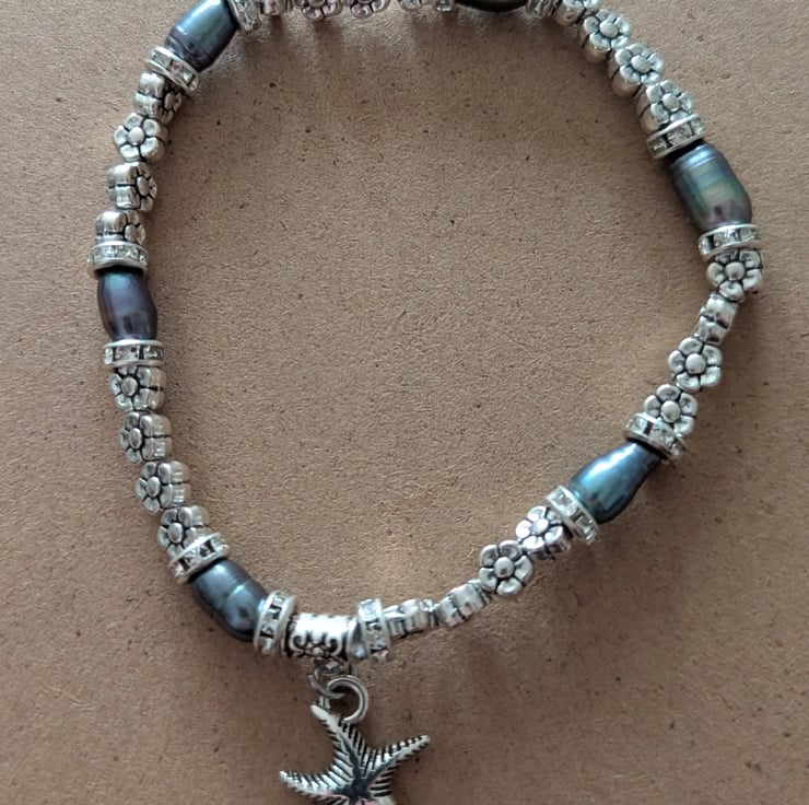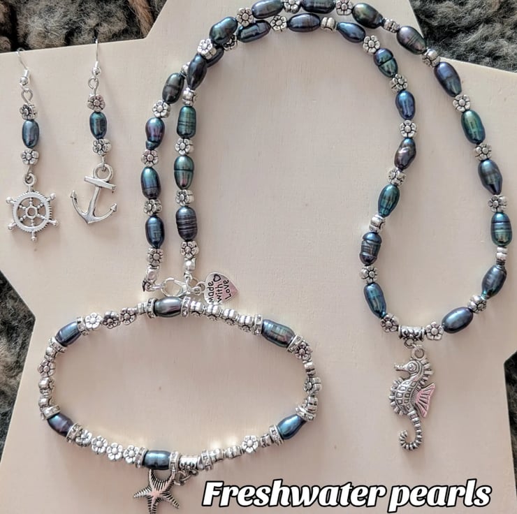 Discover this exquisite handcrafted jewellery set featuring freshwater pearls. Consisting of ocean-themed necklet, earrings and bracelet all made to order. Charms may vary but will be as close to pictured as possible.