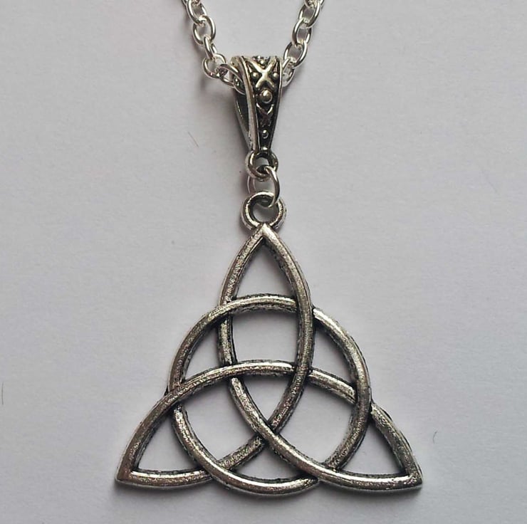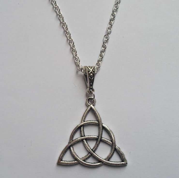 This necklace features a beautifully detailed triquetra/trinity knot pendant on silver plate 26" chain.