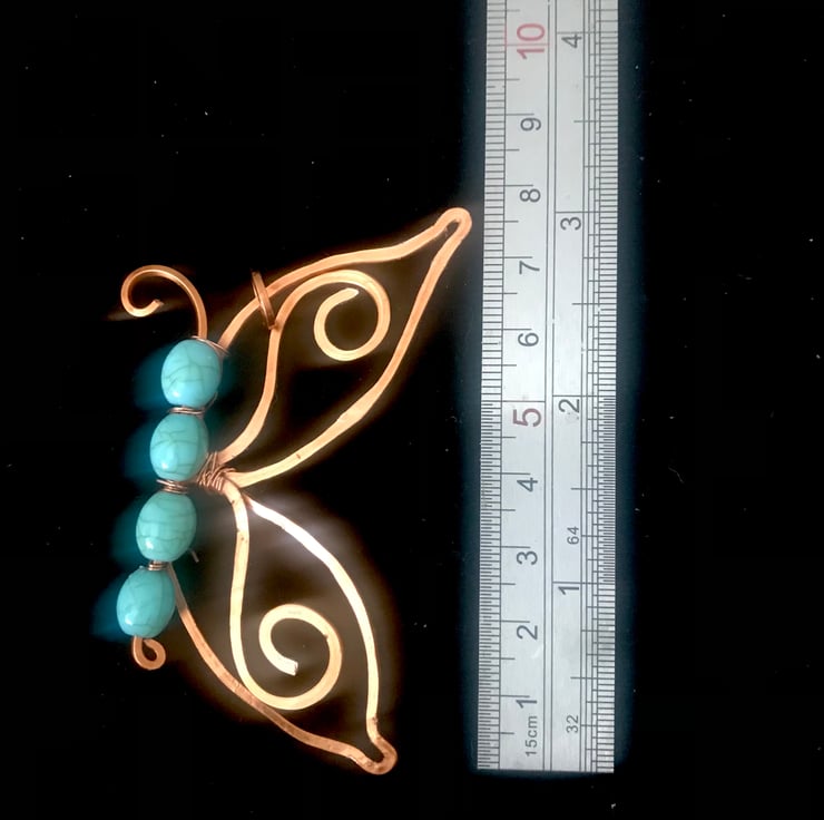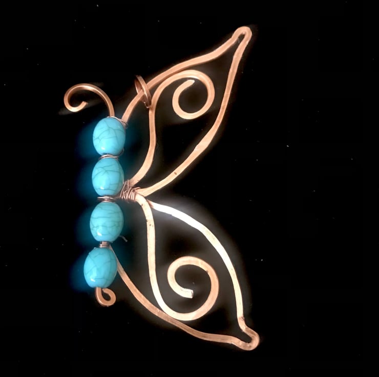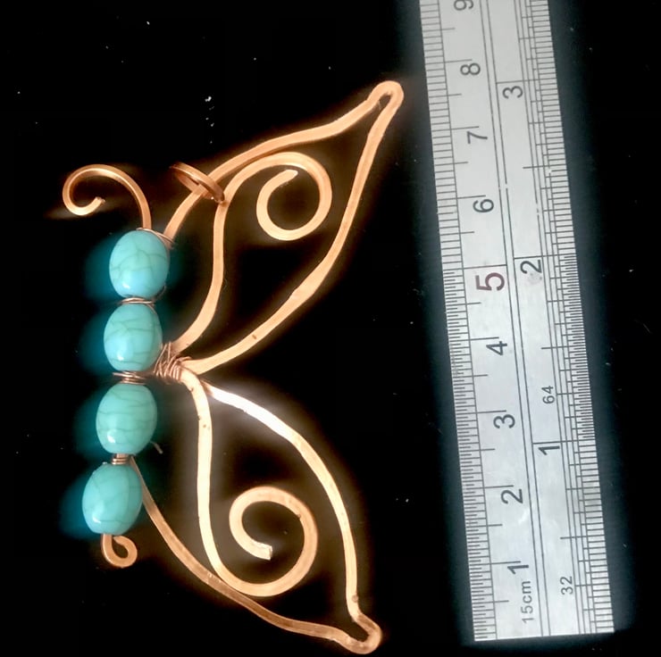 This pendant is made with high quality 1.25mm anti tarnish square copper jewellery wire and features a beautiful butterfly with turquoise oval beads. To maintain the shine and quality it is best to avoid showering etc with it on.