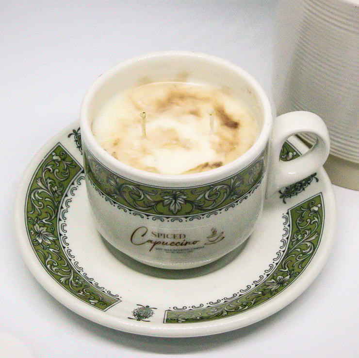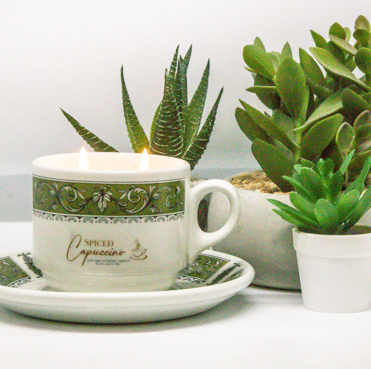 Reclaimed Range. Scented candle in a recycled coffee cup and saucer! Twin wicks for an even burn. Scented with our Spiced Capuccino fragrance
