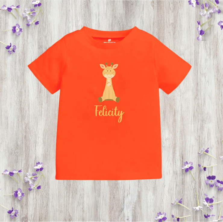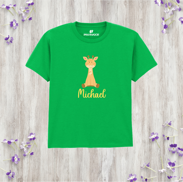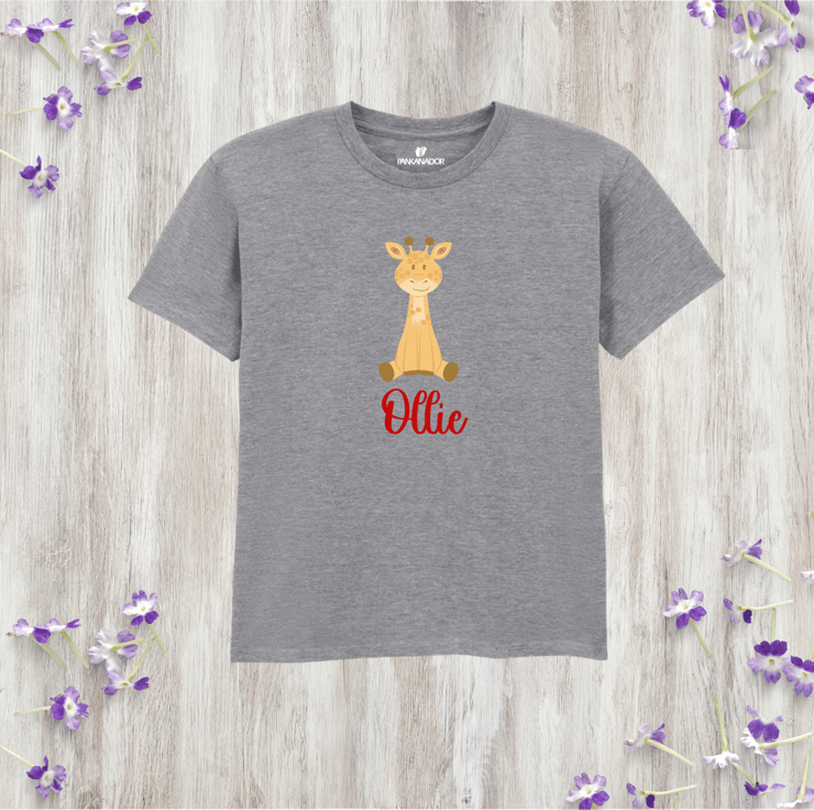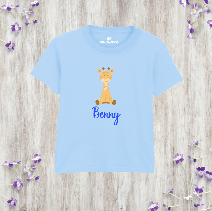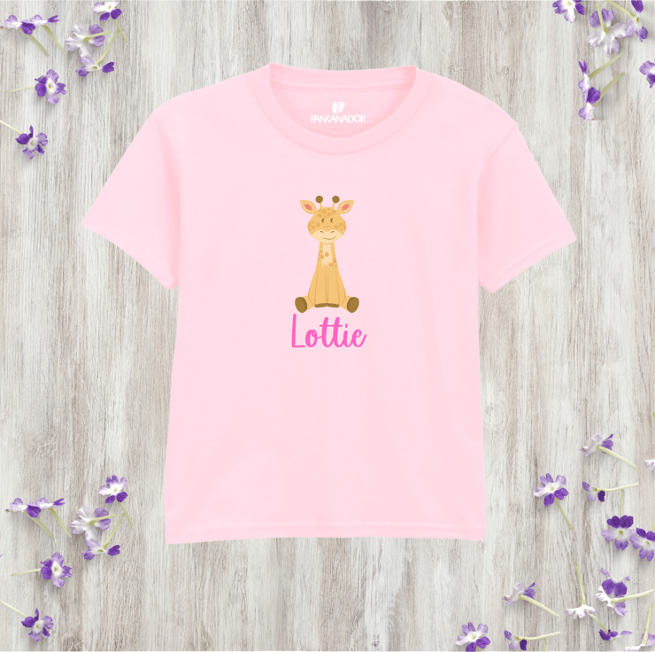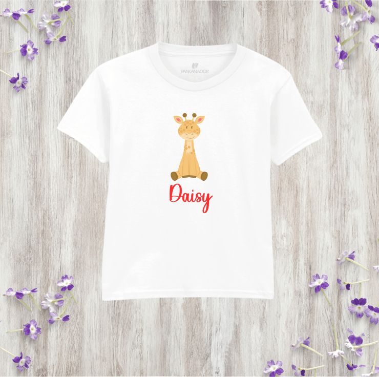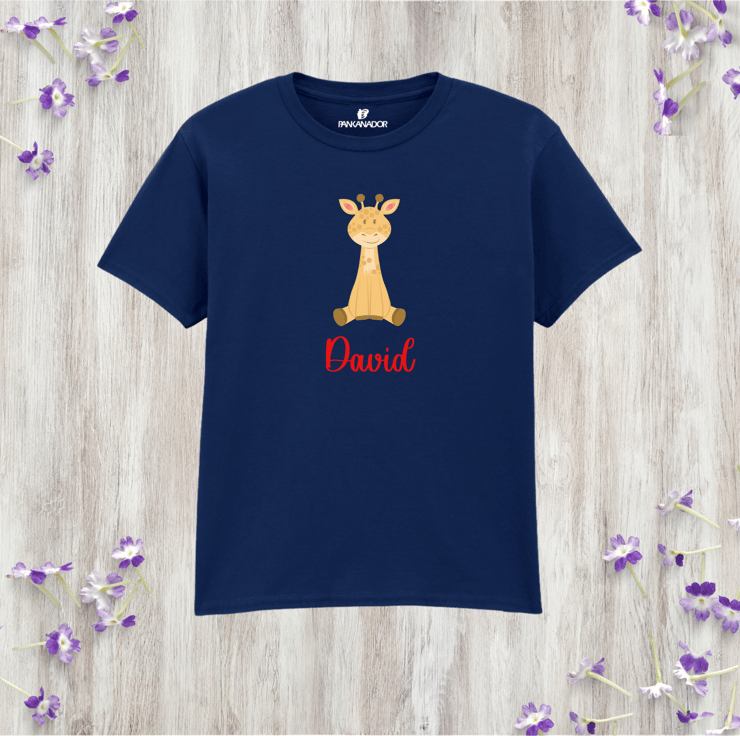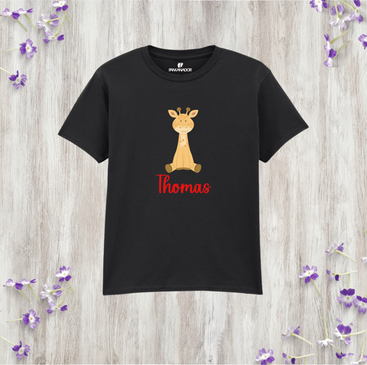 I was inspired to create this personalised children's T-shirt by the majestic and gentle nature of giraffes. Their unique height and beautiful patterns make them truly fascinating animals for children, embodying a sense of wonder and reaching for new heights.
