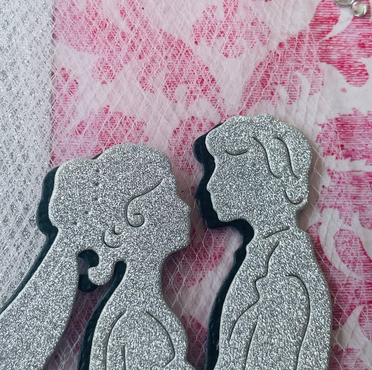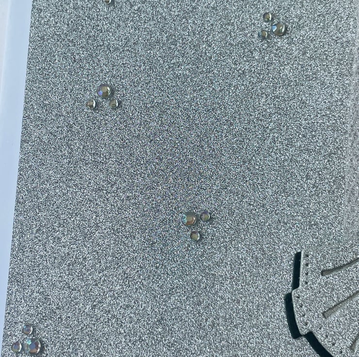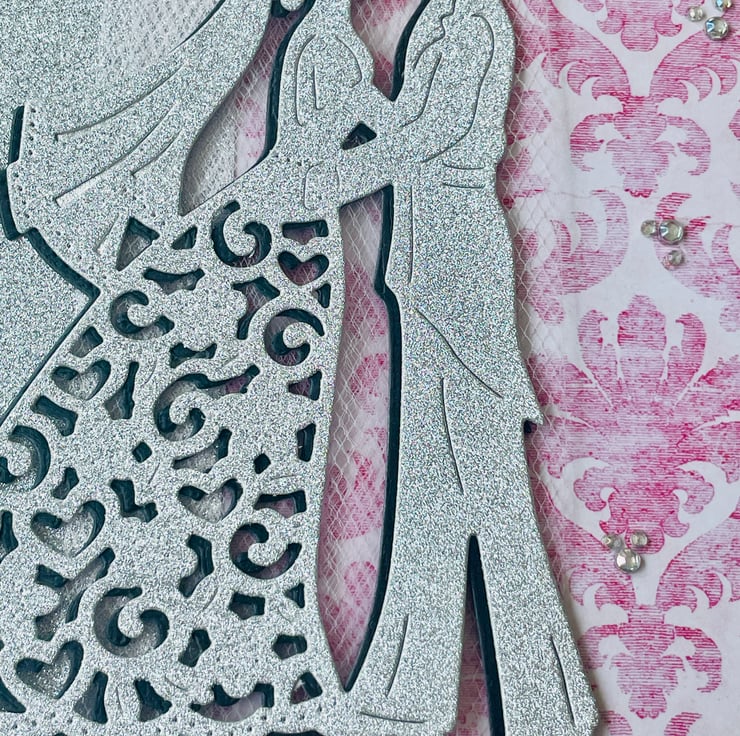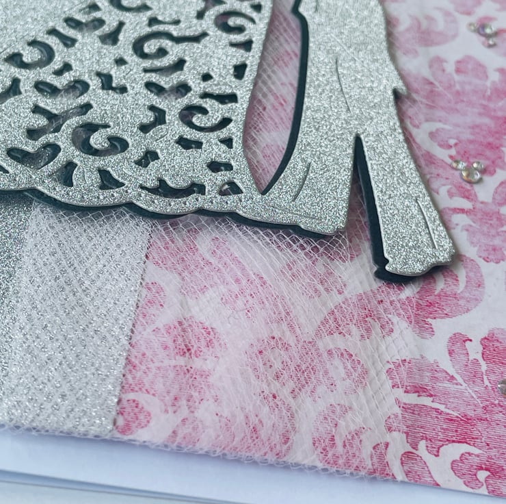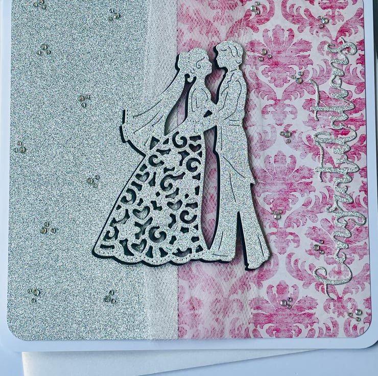 A classic and simple design for a wedding celebration. This 17.5x17.5cm card features a glitter silver (none shed so no glitter everywhere) card and pink brocade style backing paper. This is topped with pale pink tulle fabric around the join. This is topped with a silver die cut of a bride and groom, this has a drop shadow of black card to bring the image to life. They are dancing together and the brides dress has a lovely lace cut out detail. The design is finished with a matching silver glitter Congratulations placed sideways on the card plus Aurora Borealis clear gems scattered over the design. Inside the card has 2 matching pink paper banners across the bottom corner. A beautiful way to celebrate a wedding.