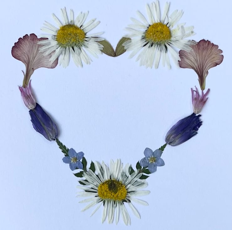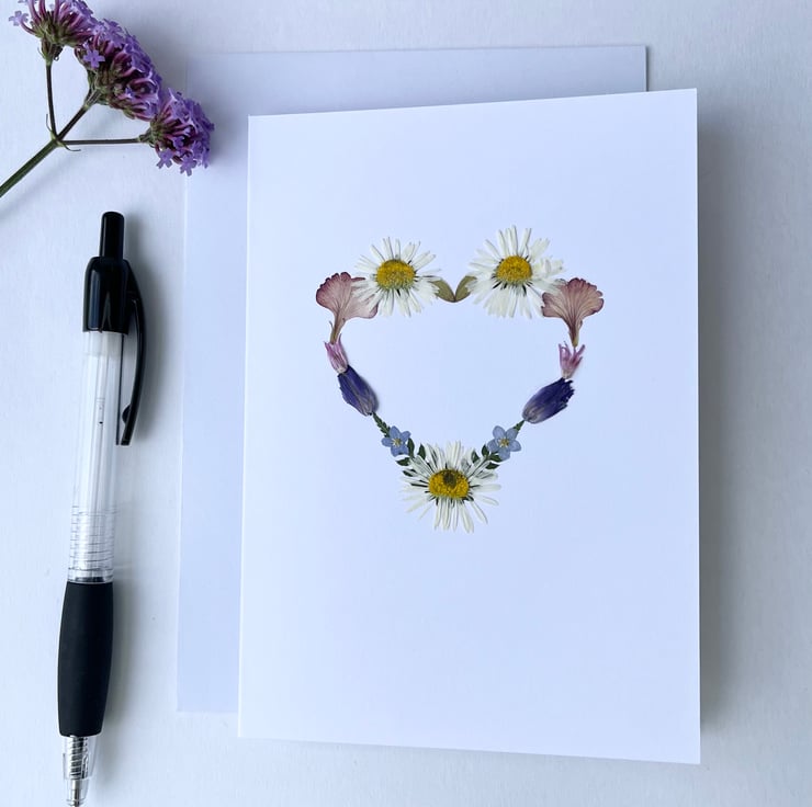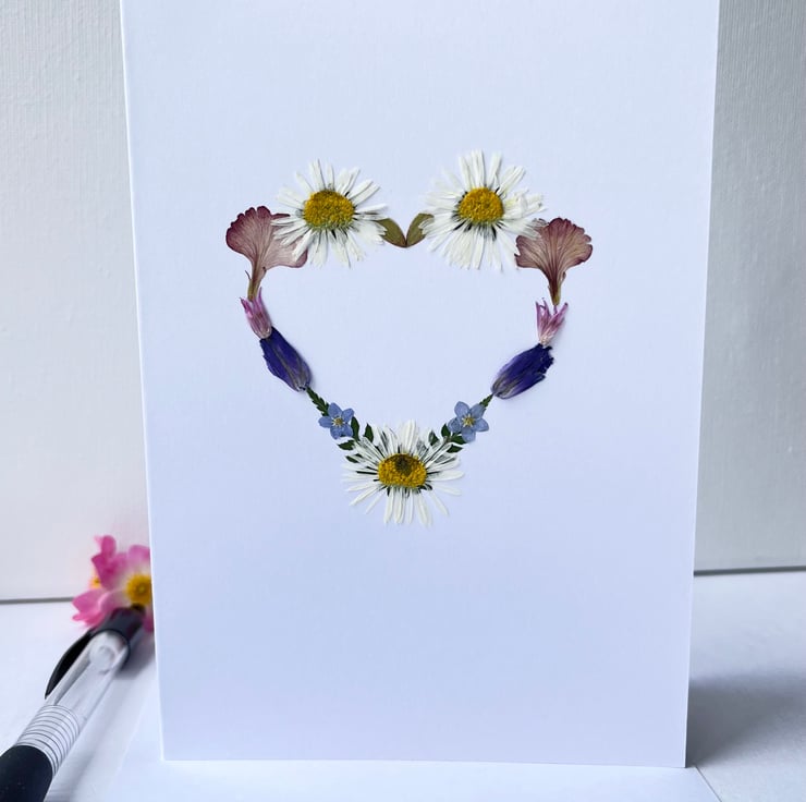 This lovingly handmade real pressed flower heart greeting card is made using flowers and foliage from our garden, with daisies collected within a mile from our home.