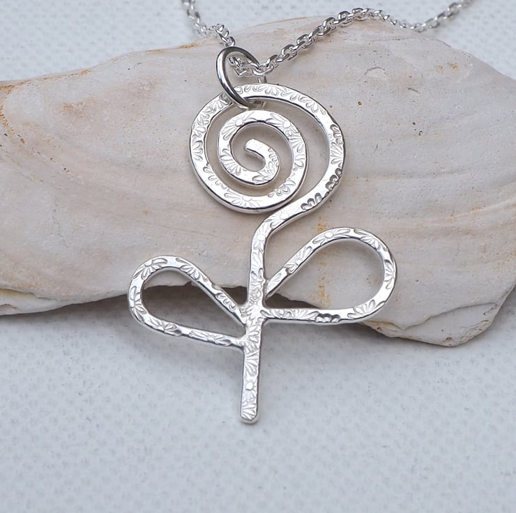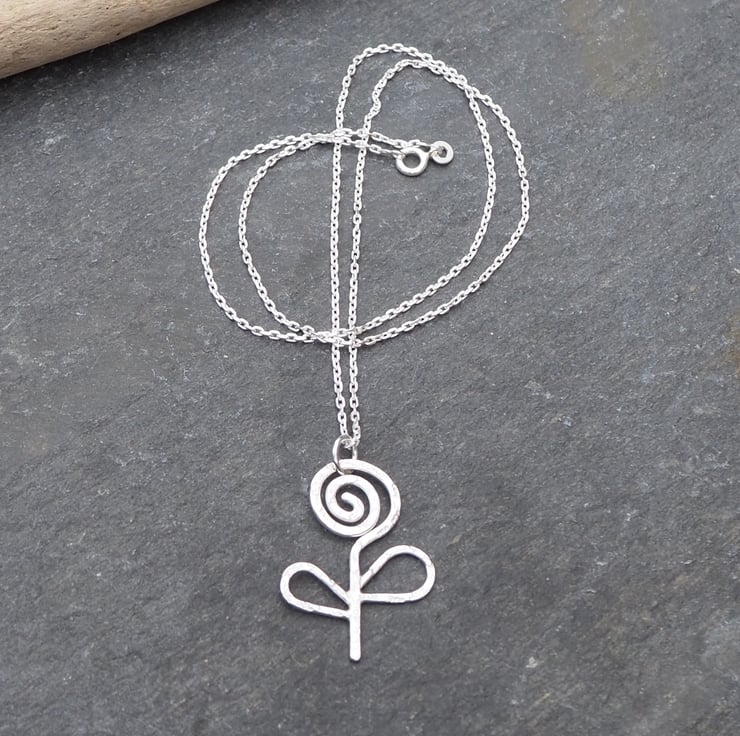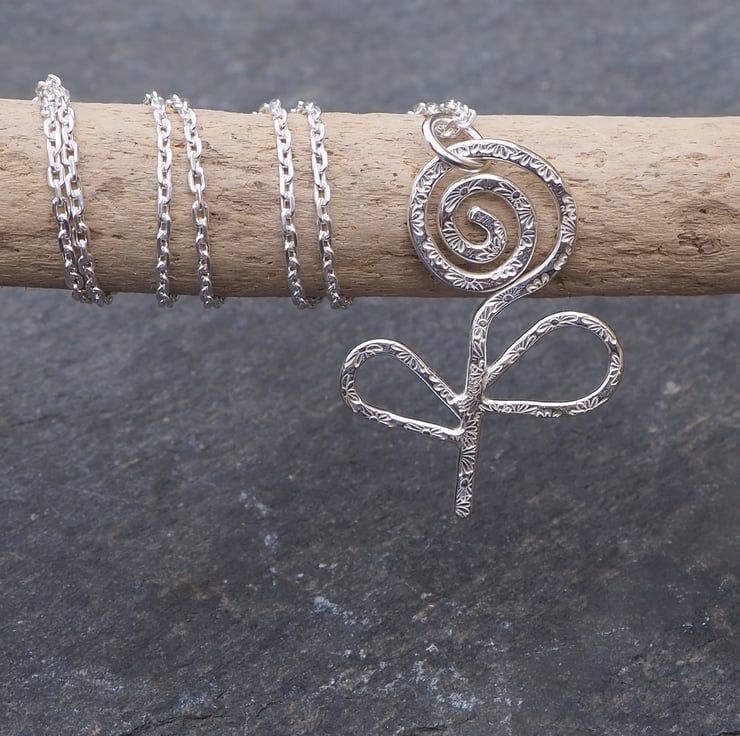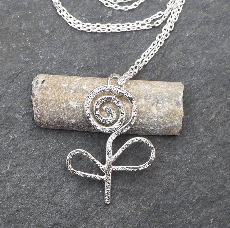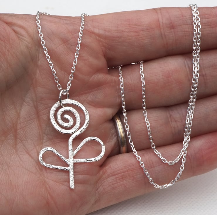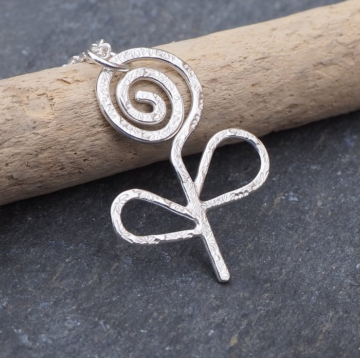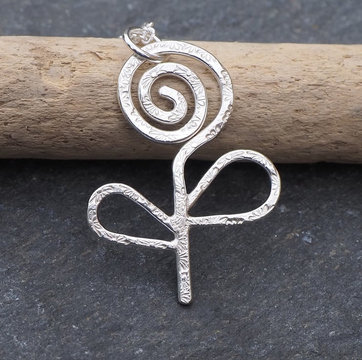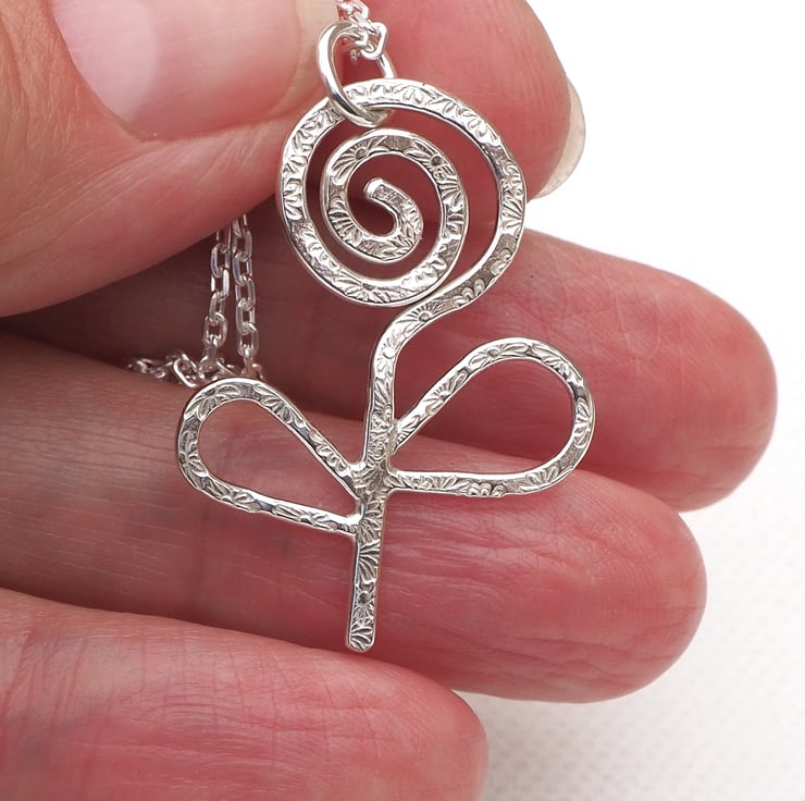 Handmade silver spiral flower pendant with petal texture punched into the surface.