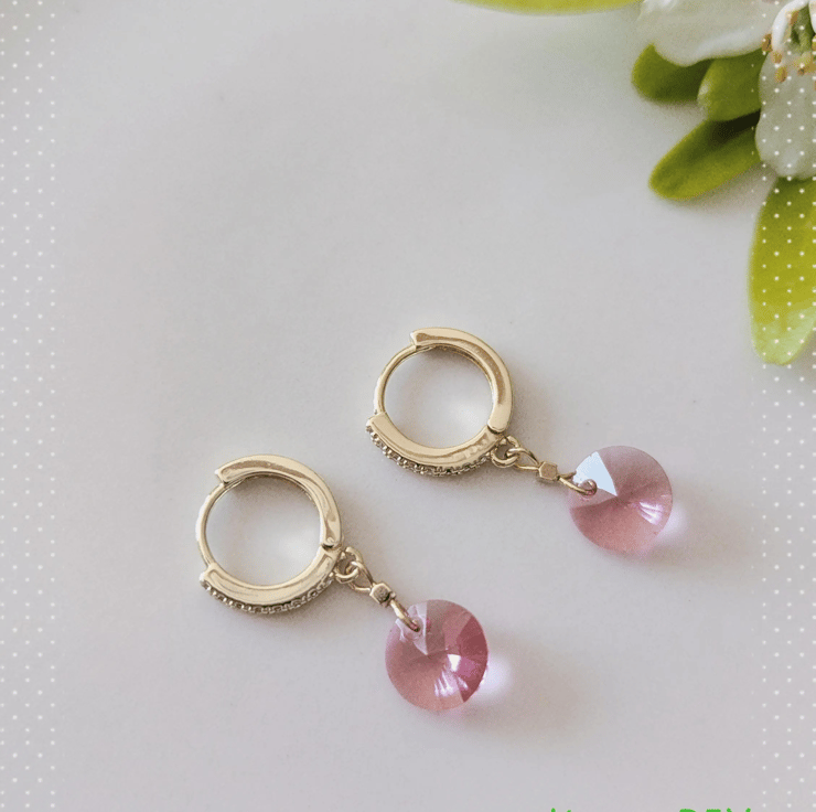 Add a touch of sparkle to your everyday or special occasion look with these beautifully crafted 14K gold-filled clip on hoop earrings. Each earring features a shimmering rhinestone-encrusted hoop with a delicate pink Swarovski crystal drop, creating a feminine and timeless design.