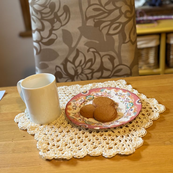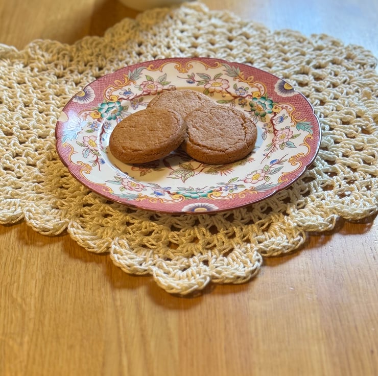 A pair of crocheted cotton placemats/table mats in a cream colour.