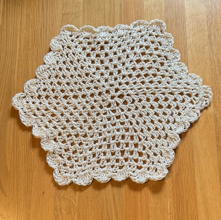 Each mat is made from a soft, lightweight cotton. Bringing the traditional craft of crochet a contemporary twist with their hexagonal shape and concave edges.