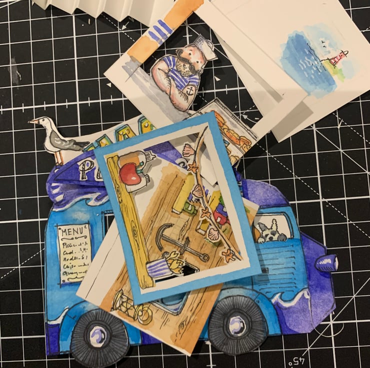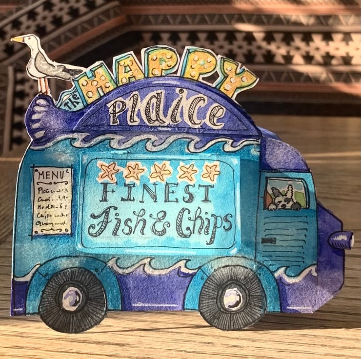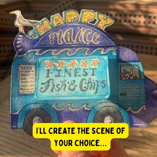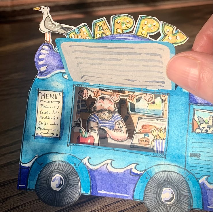 Let me create a personalised 3D illustrated scene for you to treasure or give as a unique gift, like this cute street food van! Each layer of the scene will be painstakingly drawn, painted and cut by hand and assembled, to create a perfect diorama. This can be presented as a framed piece of art or as a freestanding 'tunnel book', to be picked up and enjoyed.