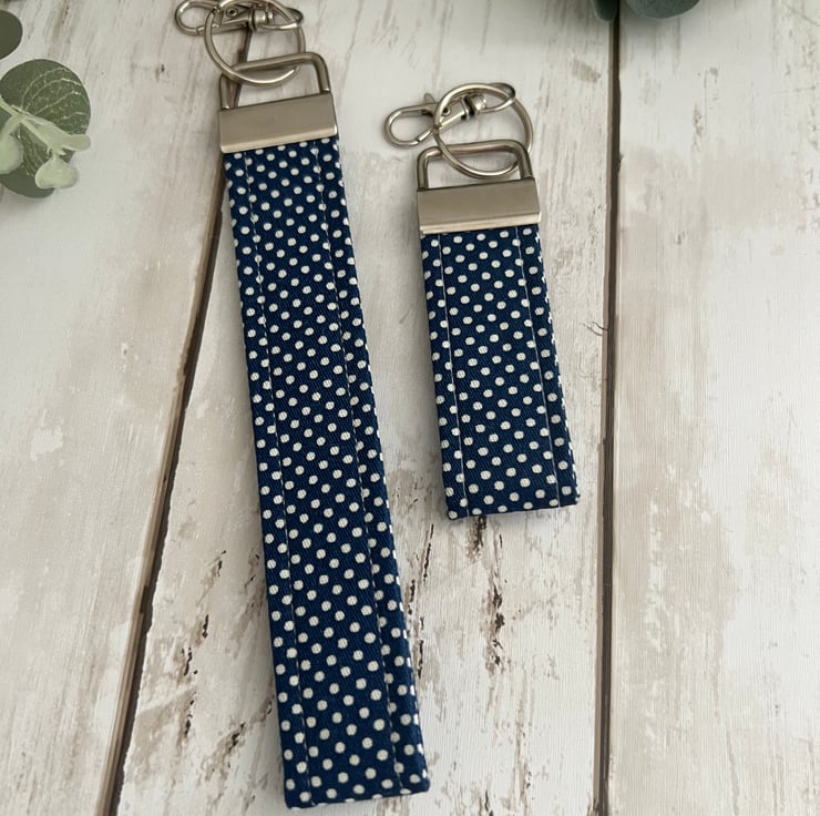 Handmade fabric key fob wristlet set, key chain, bag strap in a navy & white polka dot design.