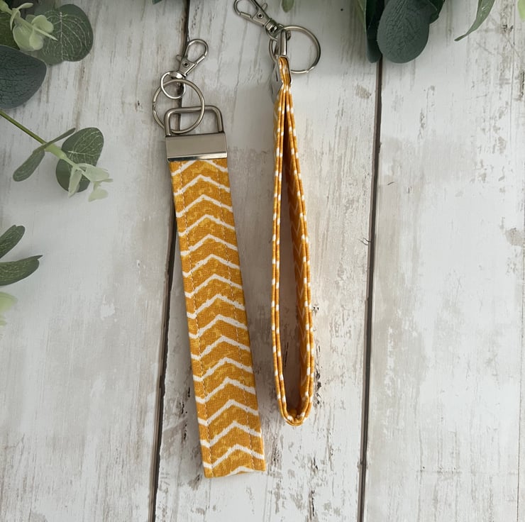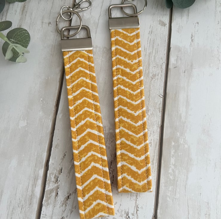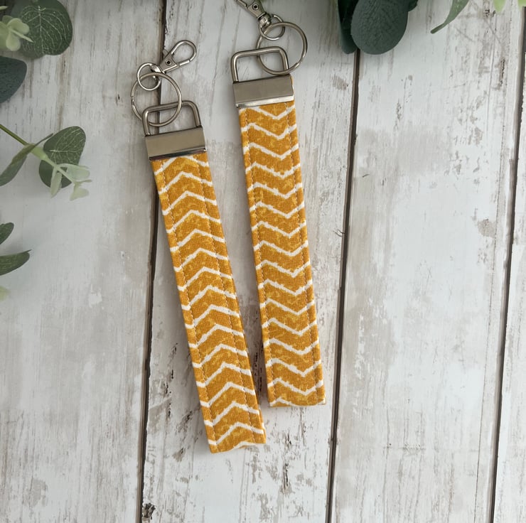Handmade fabric key fob wristlet set, key chain, bag strap in a mustard yellow and white chevron design.