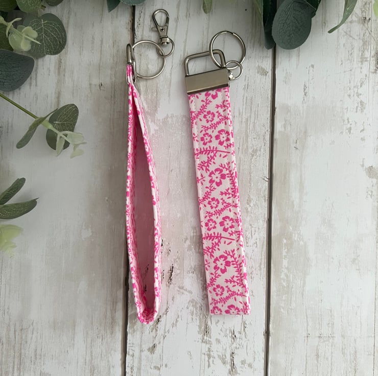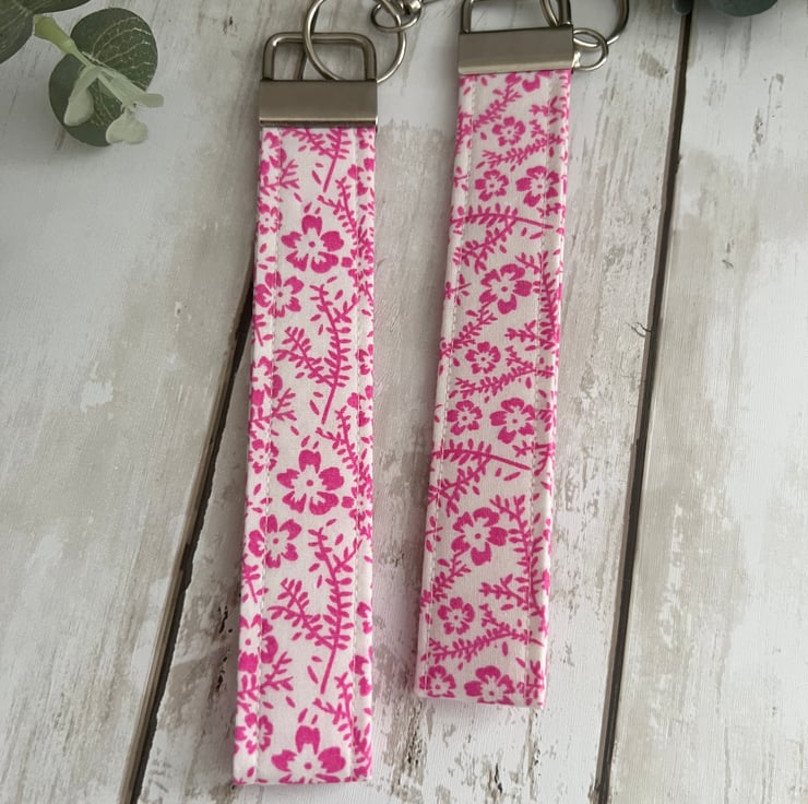 Handmade fabric key fob wristlet set, key chain, bag strap in a pink & white floral design.