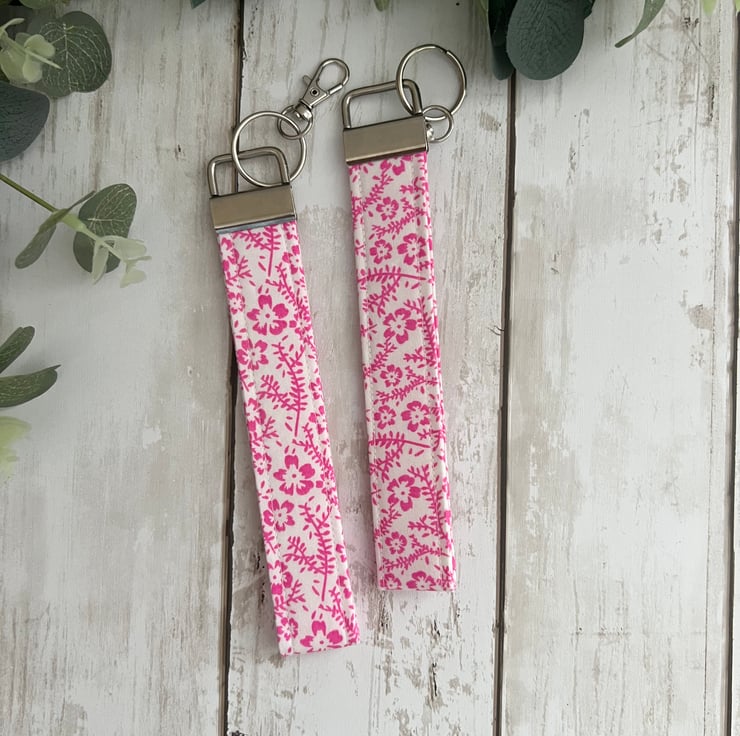 Key Fob Wristlet Set in Pink & White Floral Fabric, Bag Strap