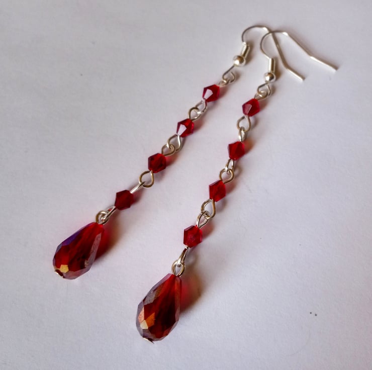 These stunning earrings have dangling strands of red crystals hanging on silver plate hooks.